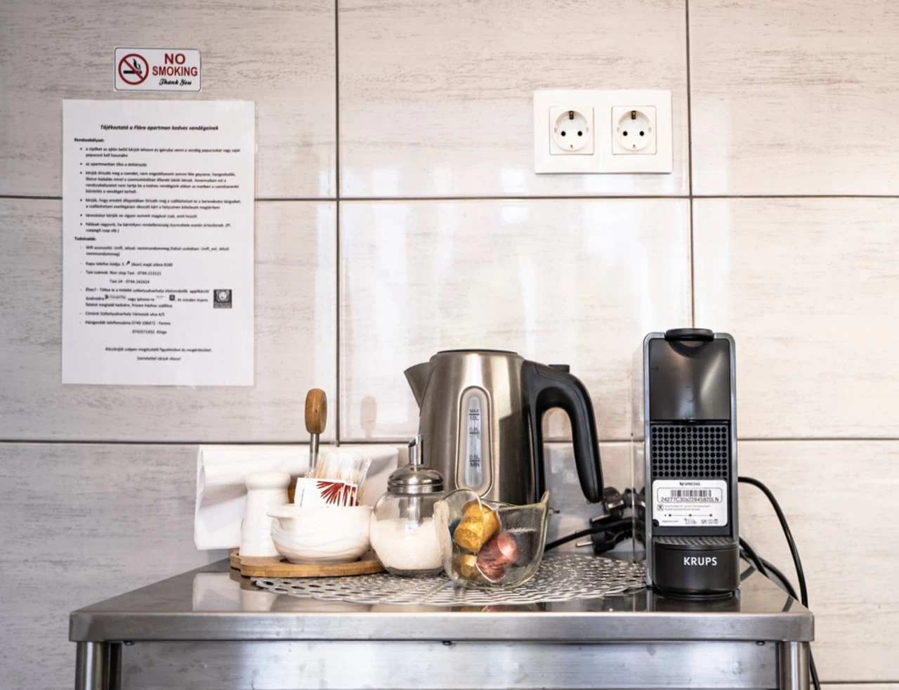 Bucatarie complet utilata, cu frigider, cuptor cu microunde, plita electrica, congelator, aparat de ceai si cafea