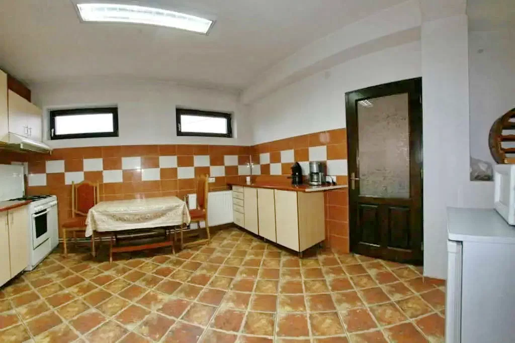 Deasemenea,oaspetii nostri pot utiliza bucataria utilata cu mijloace moderne). in curte se gaseste terenul de sport, parcare, iar pentru copii, jucarii din lemn si groapa cu nisip.