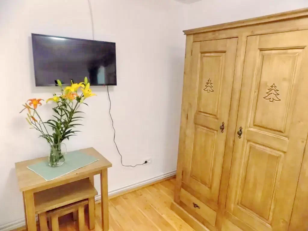 - Apartament studio (3-4 persoane), camera cu pat matrimonial din care se intra intr-o camera mai mica cu canapea extensibila cu două locuri, baia este cu intrare din prima camera)