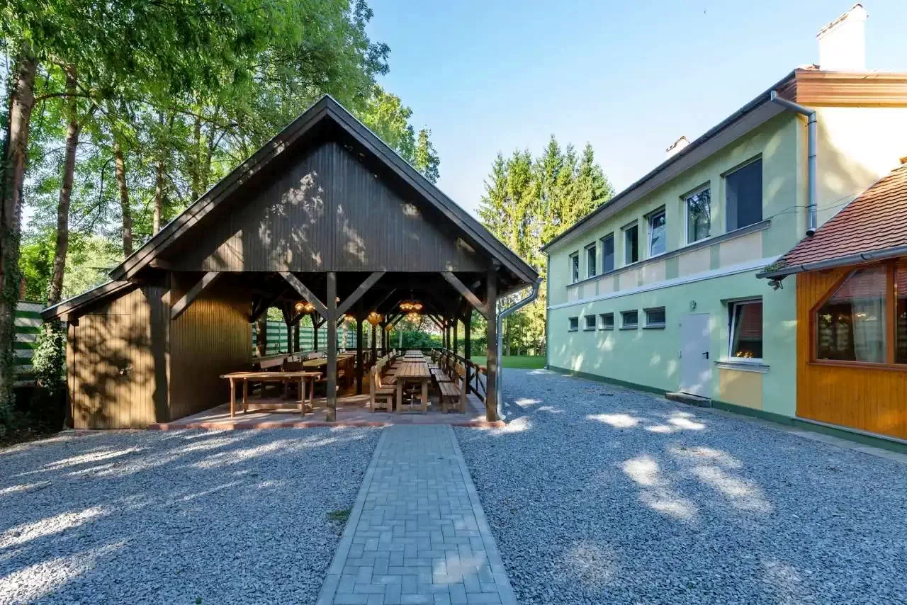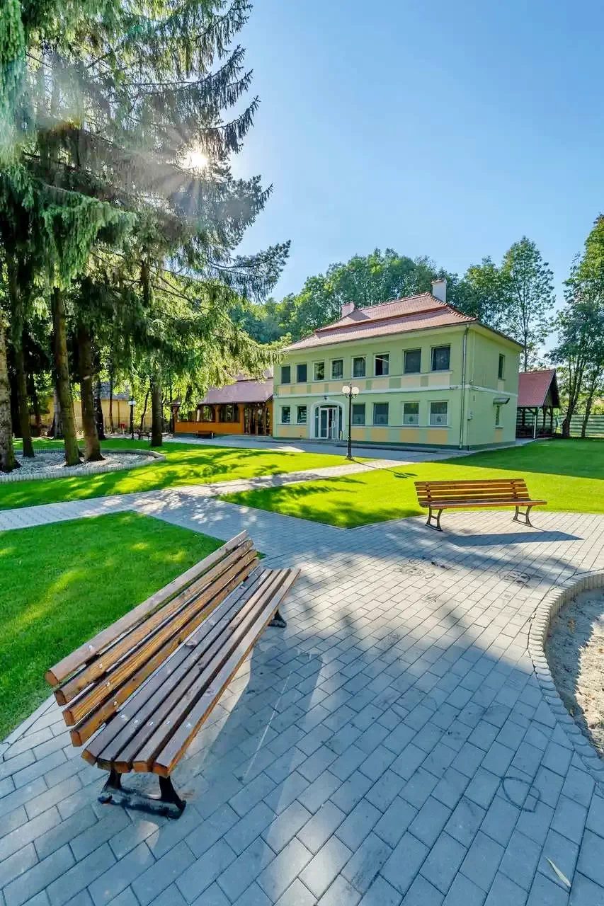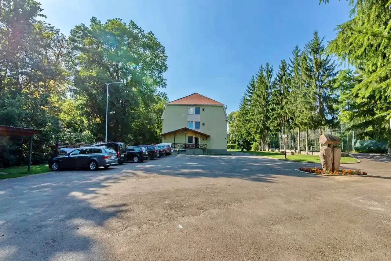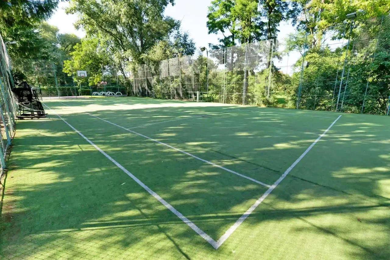 În fața clădirii se află un gazon artificial, un teren de tenis și un loc de parcare pentru 40 de mașini.