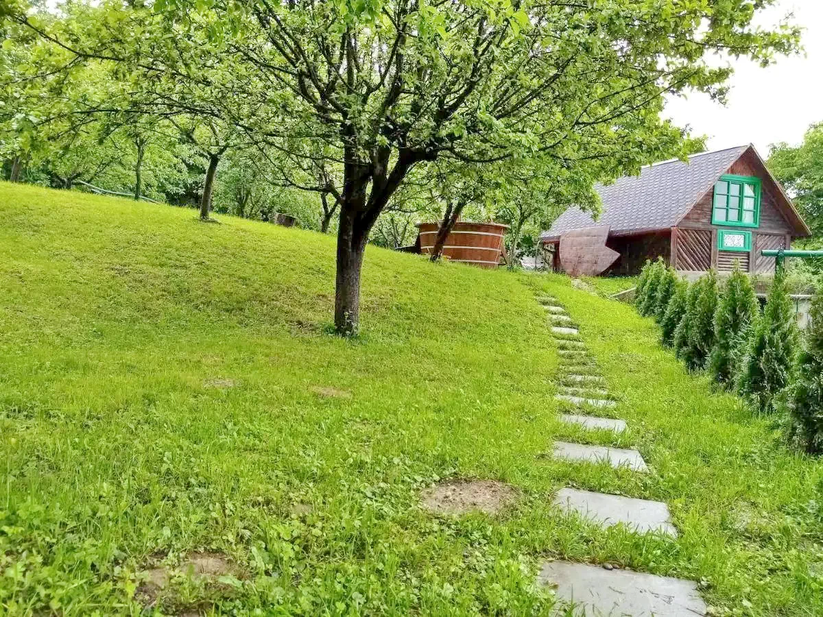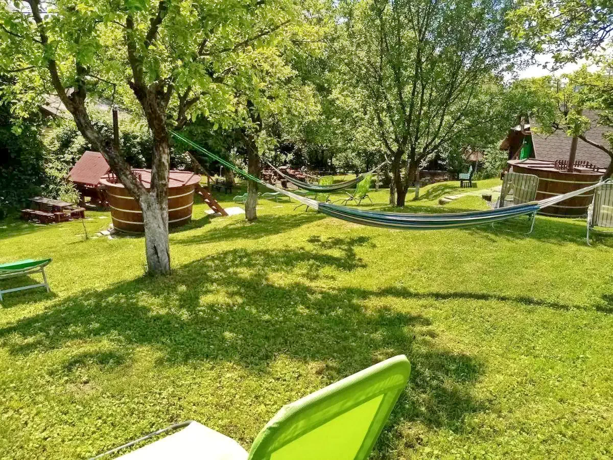 Grădină amenajată: Spațiu verde generos, cu hamace, șezlonguri, zonă pentru grătar și ceaun.
