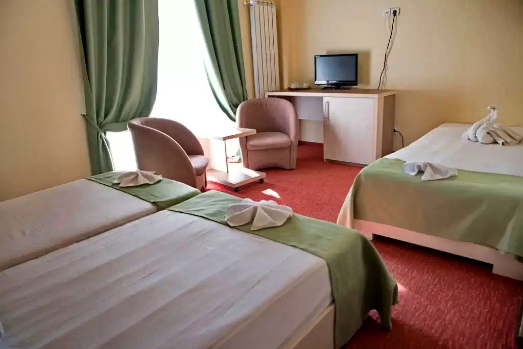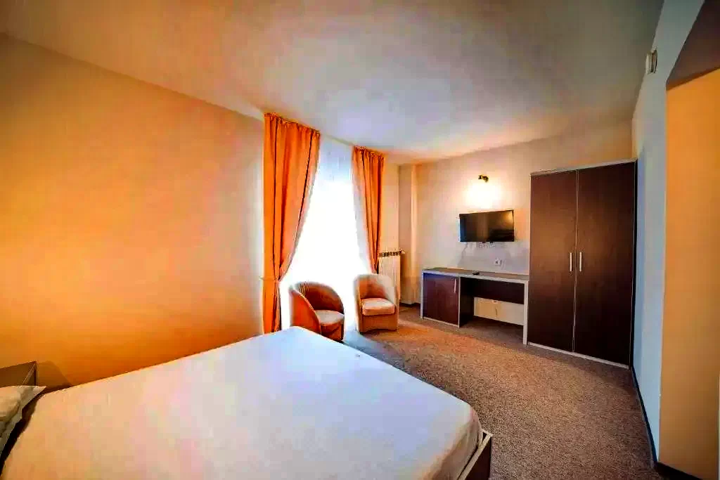 - Camerele spaţioase de la Hotel Resort sunt decorate în nuanţe de roşu, crem şi maro şi beneficiază de mobilier modern.