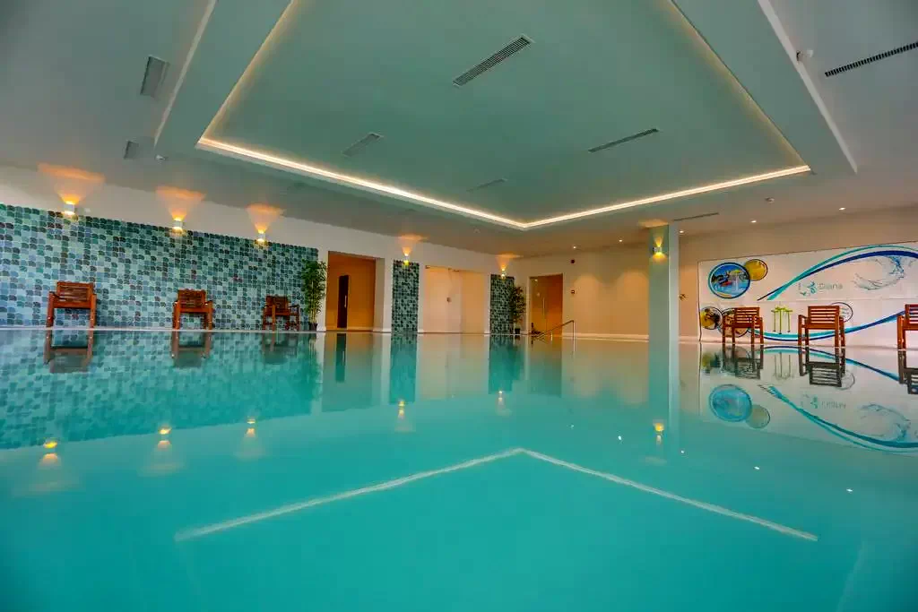 - Piscina interioară are ferestre din podea până la tavan care permit să intre multă lumină naturală. Oaspeţii au la dispoziţie 4 tipuri de saune care oferă beneficiile unei experienţe adevărate de Wellness.