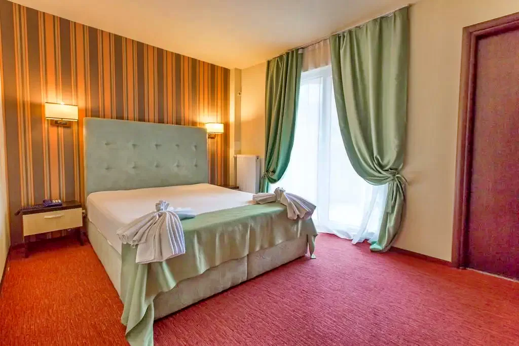 - Camerele spaţioase de la Hotel Resort sunt decorate în nuanţe de roşu, crem şi maro şi beneficiază de mobilier modern.