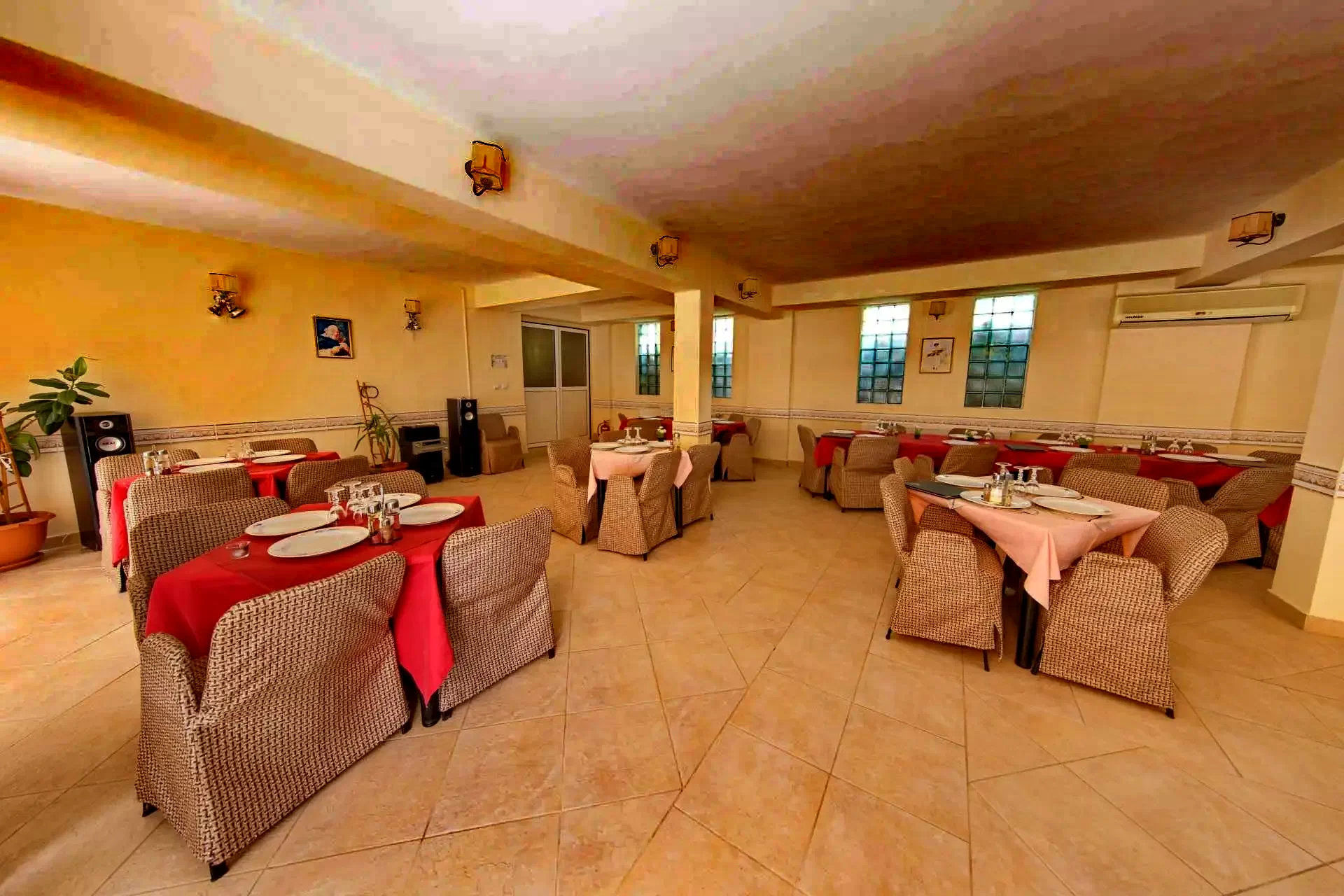 - Restaurantul elegant împreuna cu terasa (150 locuri), oferă masa “a la carte” si ambianta adorata aproape de natura. Când vremea este frumoasă, oaspeţii pot face plajă pe o terasă.