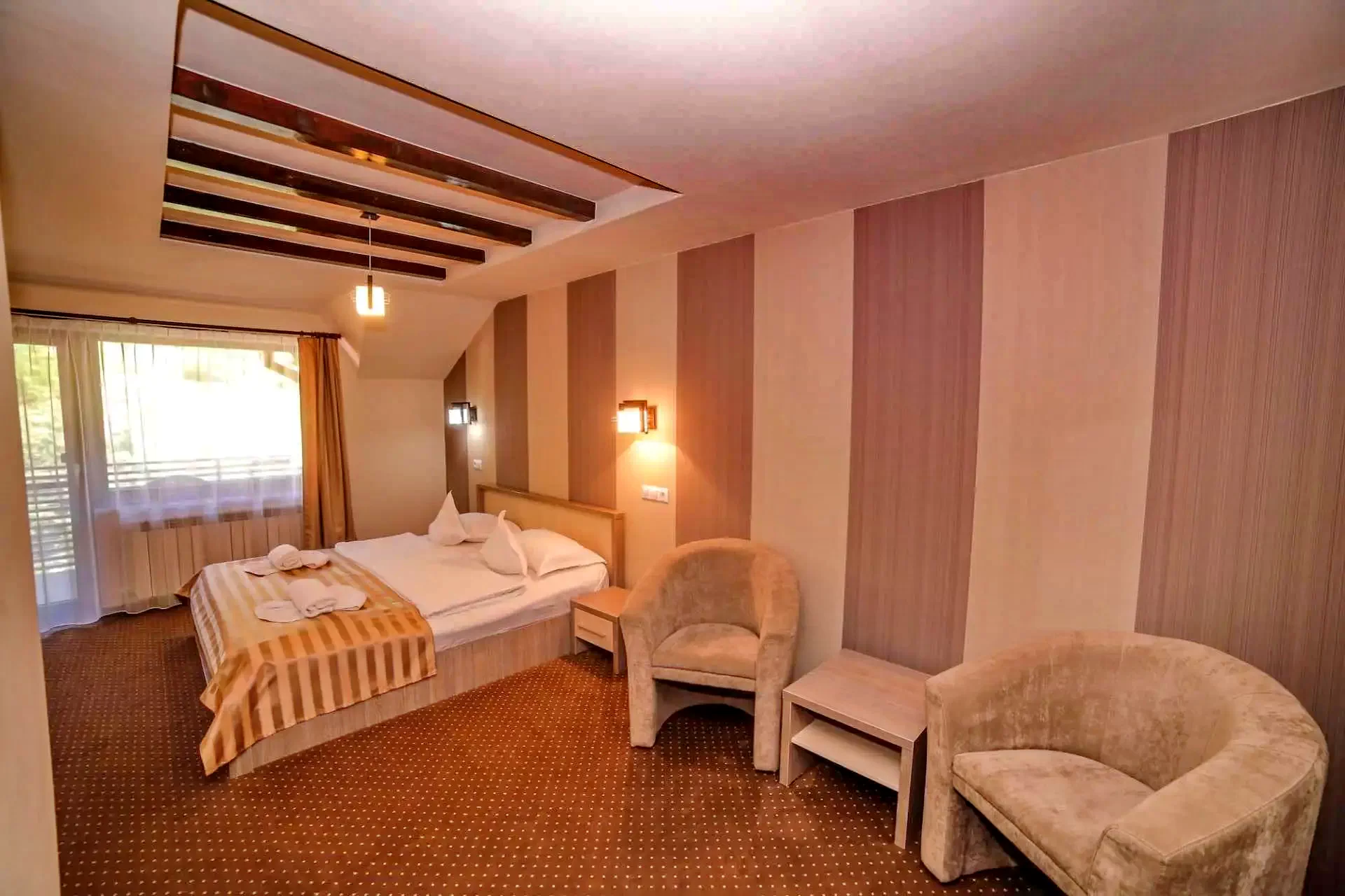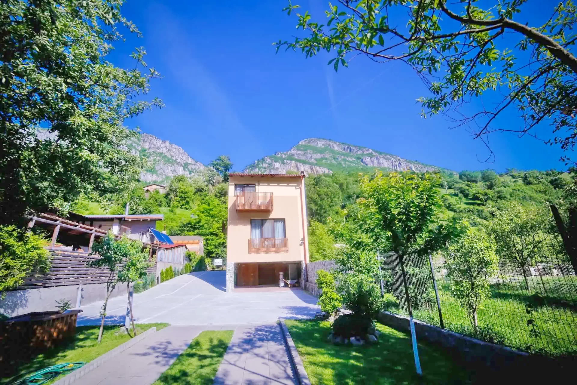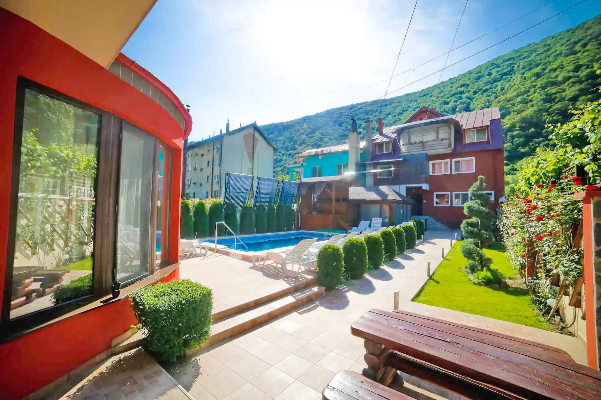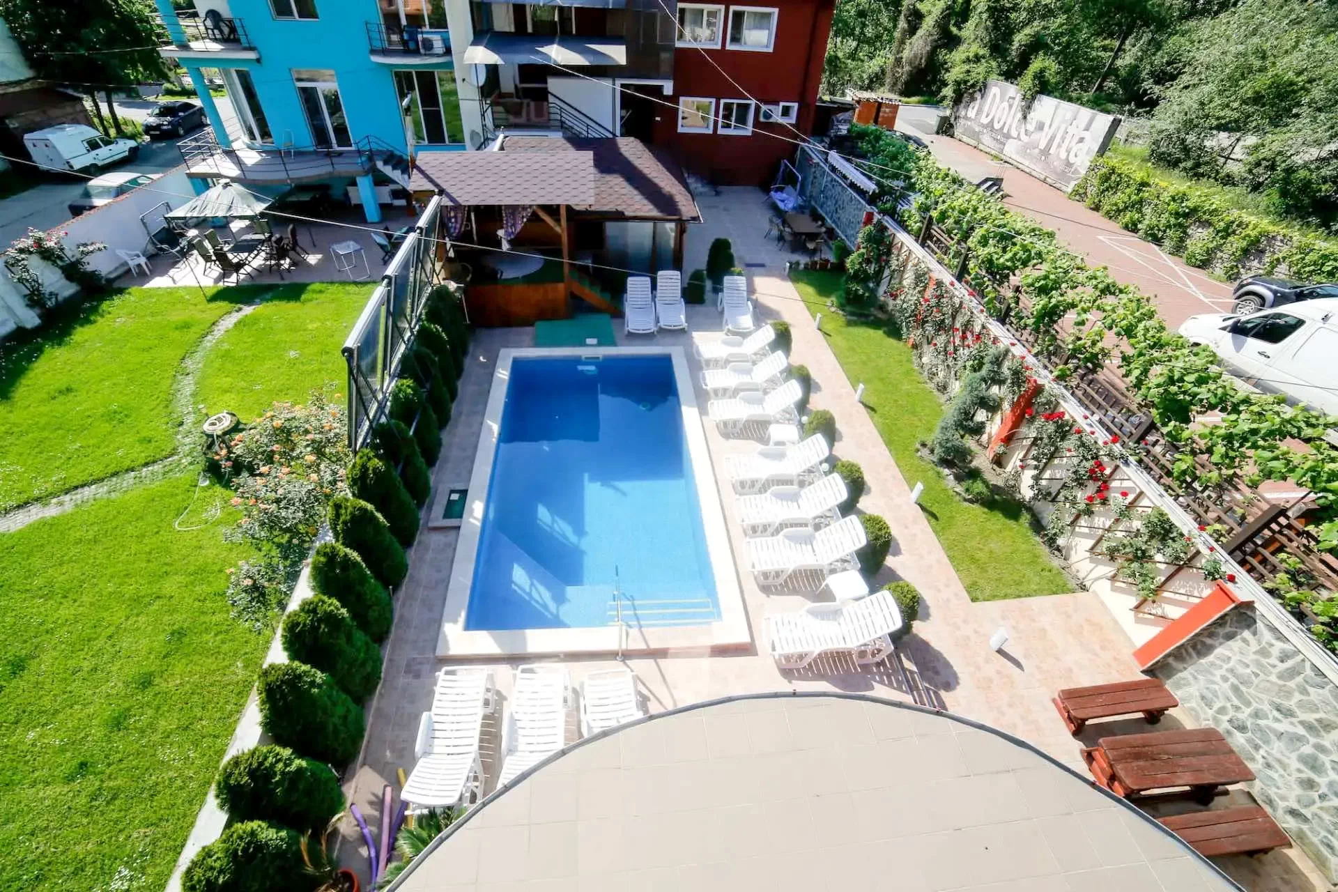 Cu o suprafață de 2000 de metri pătrați de parc amenajat, oferă cazare în 16 camere spațioase și luxoase, cu aer condiționat, pentru 32 de persoane, cu vedere panoramică la munții din jur. Facilitățile includ piscine interioare și exterioare, un restaurant excelent, săli de conferințe.