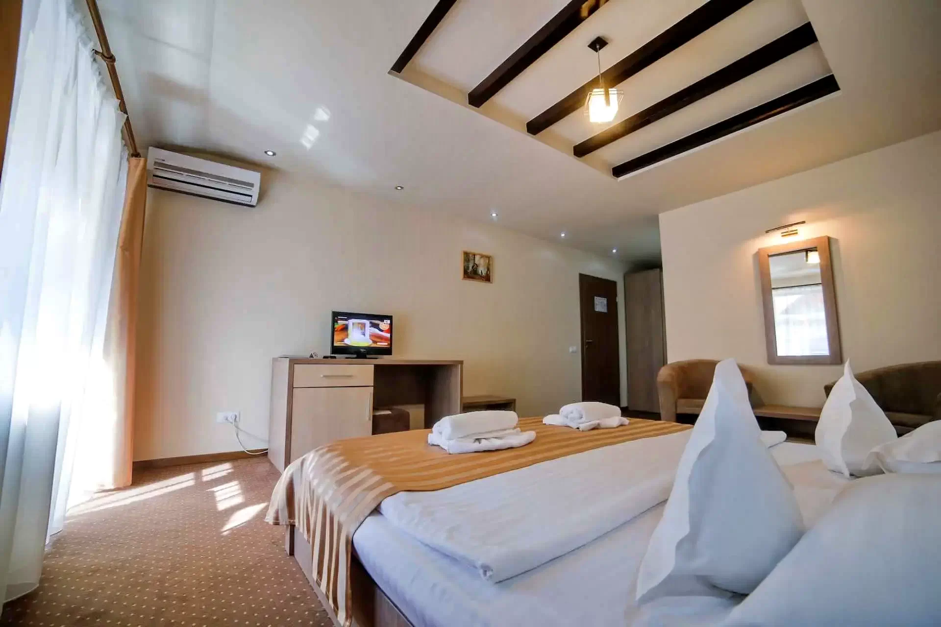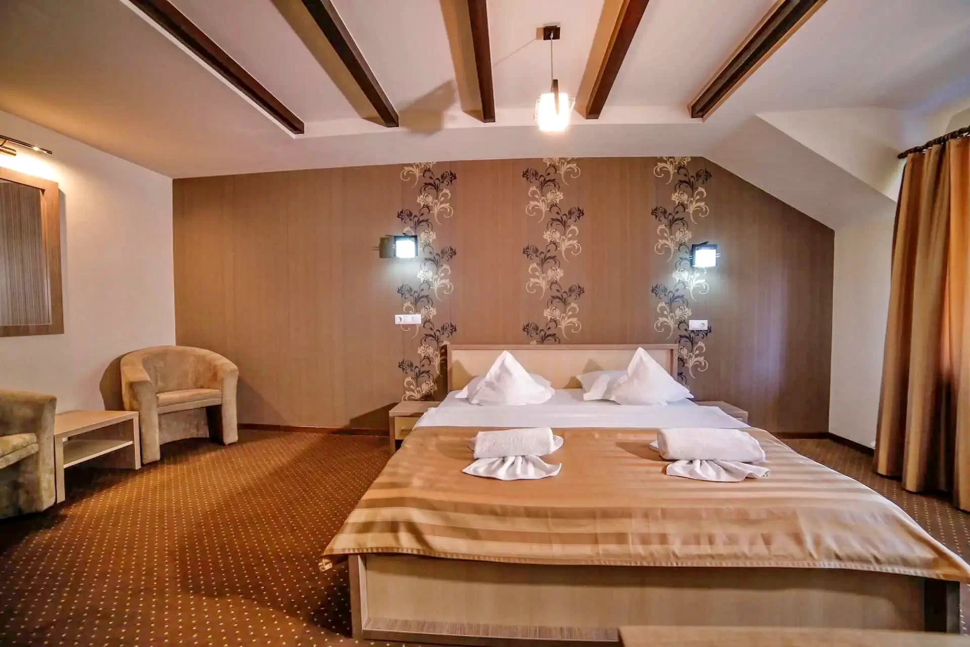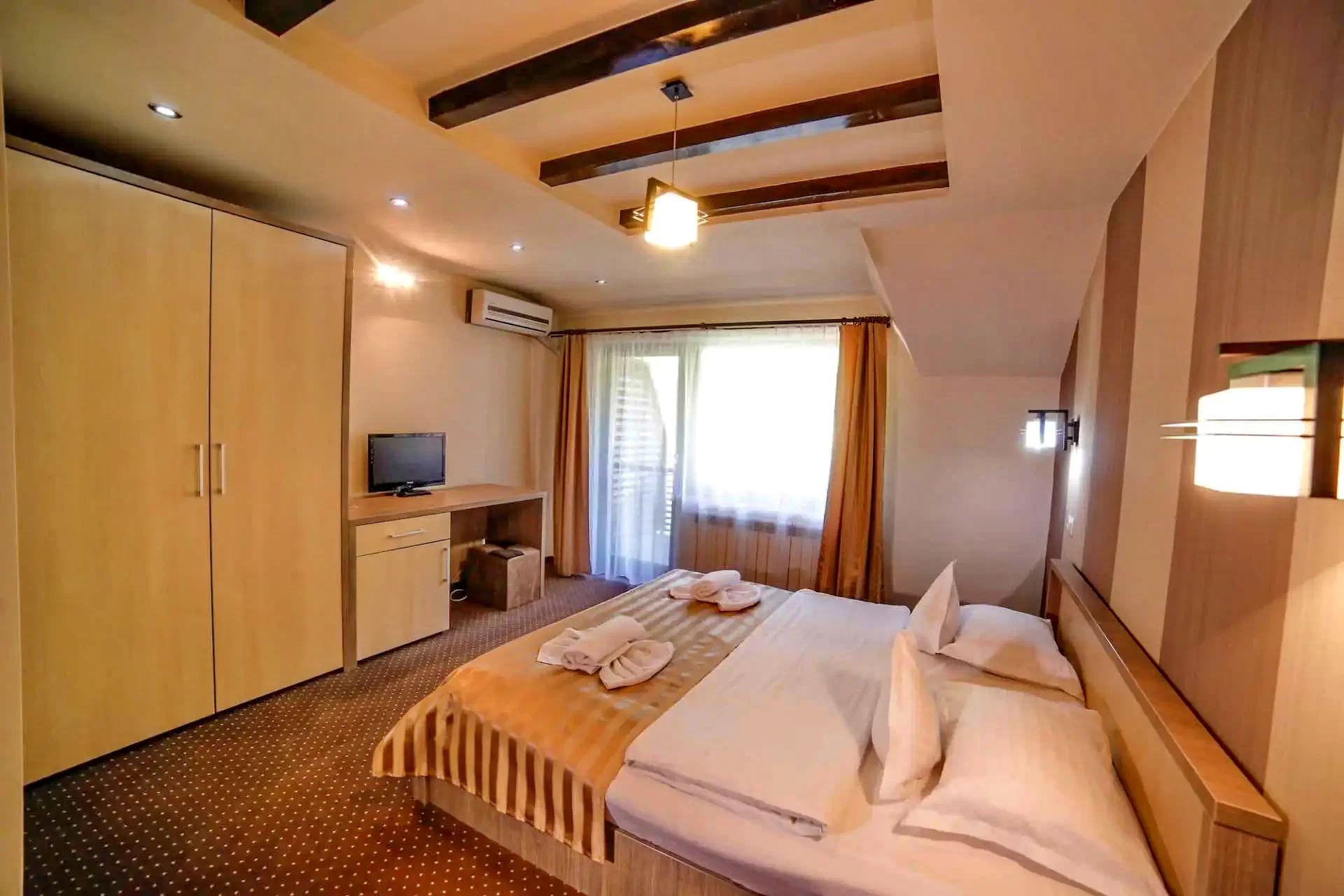 Cu o suprafață de 2000 de metri pătrați de parc amenajat, oferă cazare în 16 camere spațioase și luxoase, cu aer condiționat, pentru 32 de persoane, cu vedere panoramică la munții din jur. Facilitățile includ piscine interioare și exterioare, un restaurant excelent, săli de conferințe.