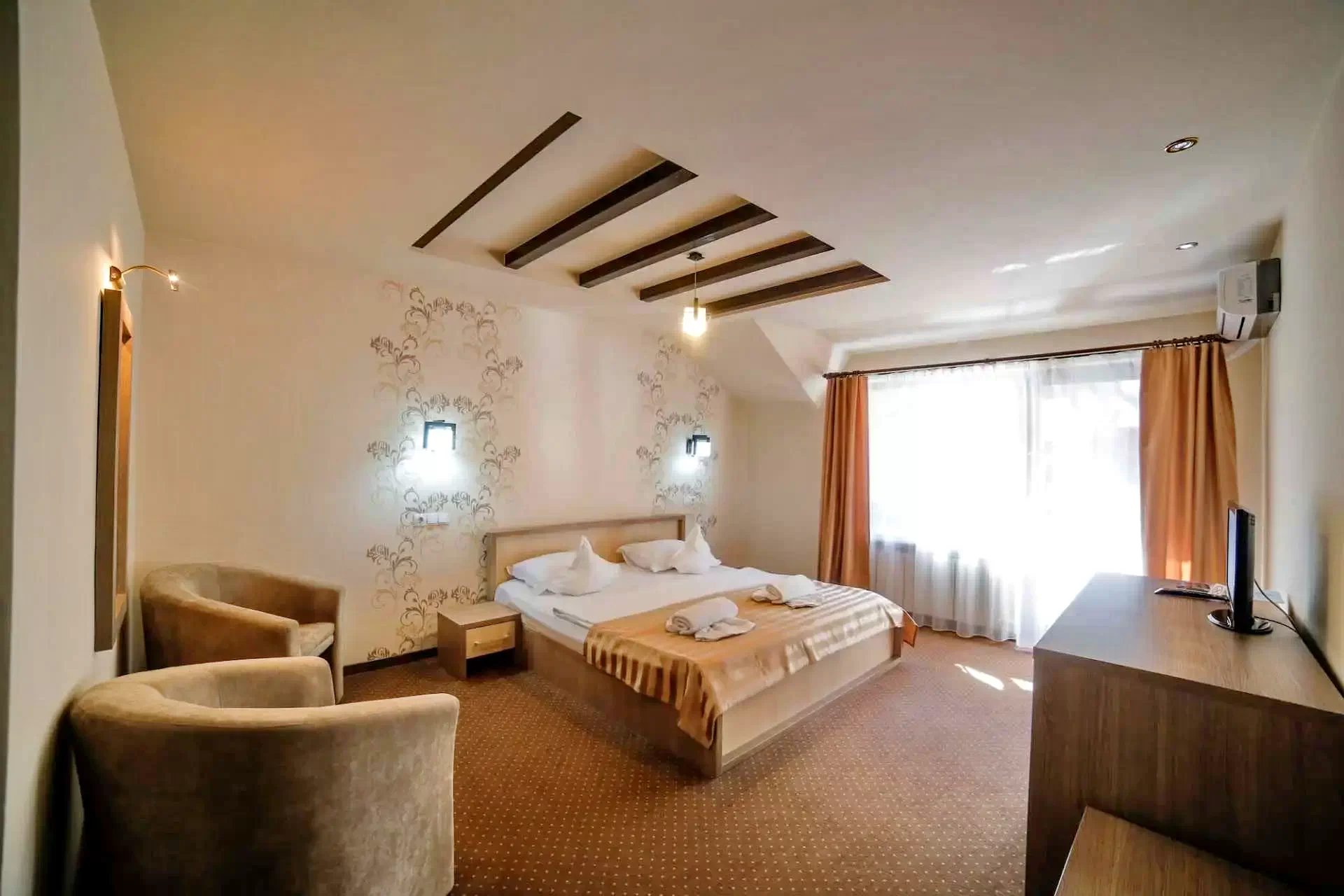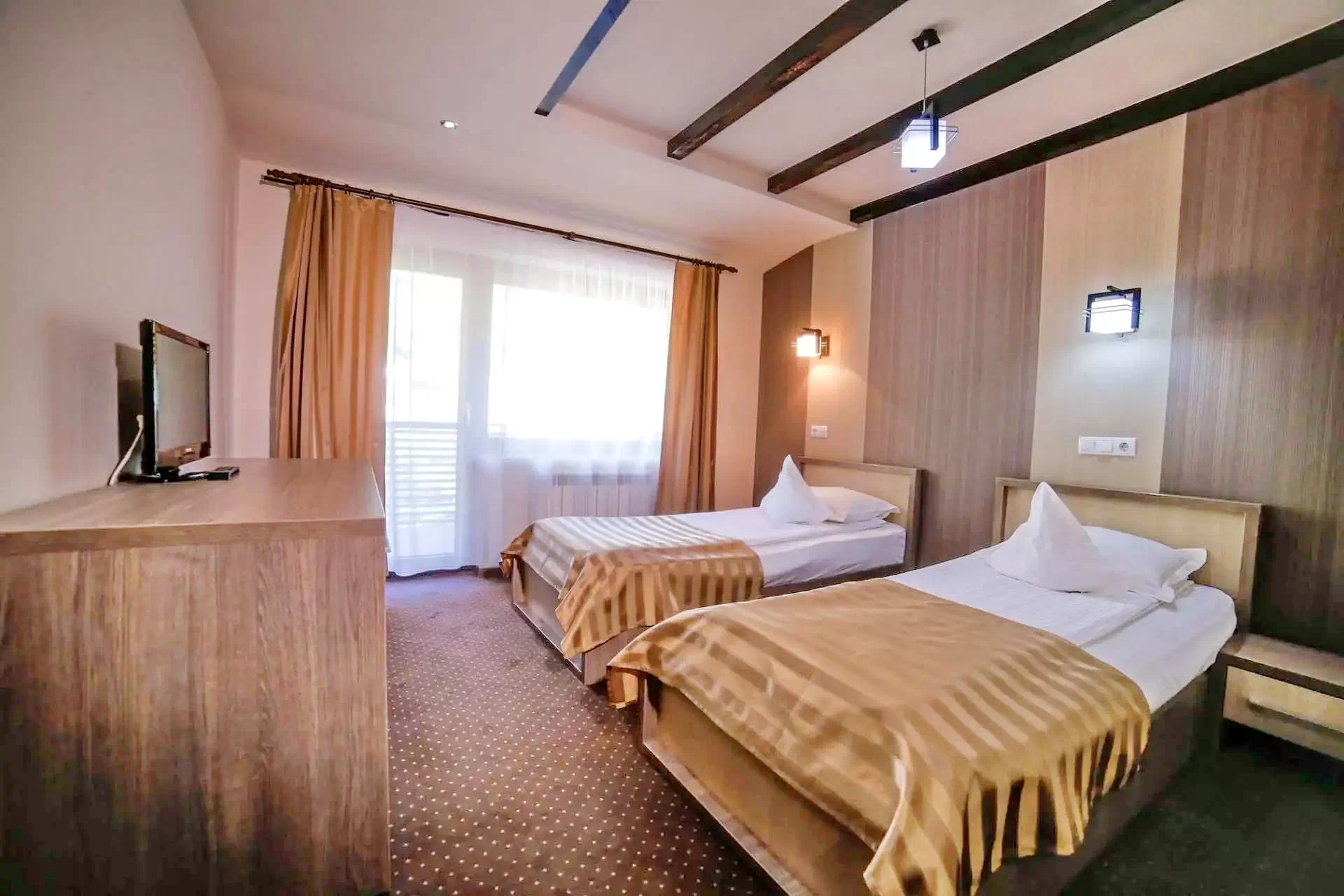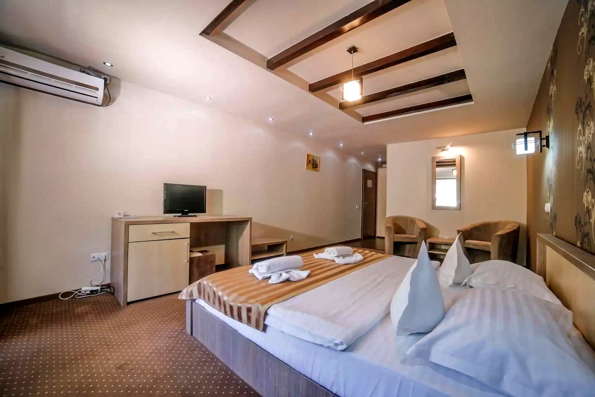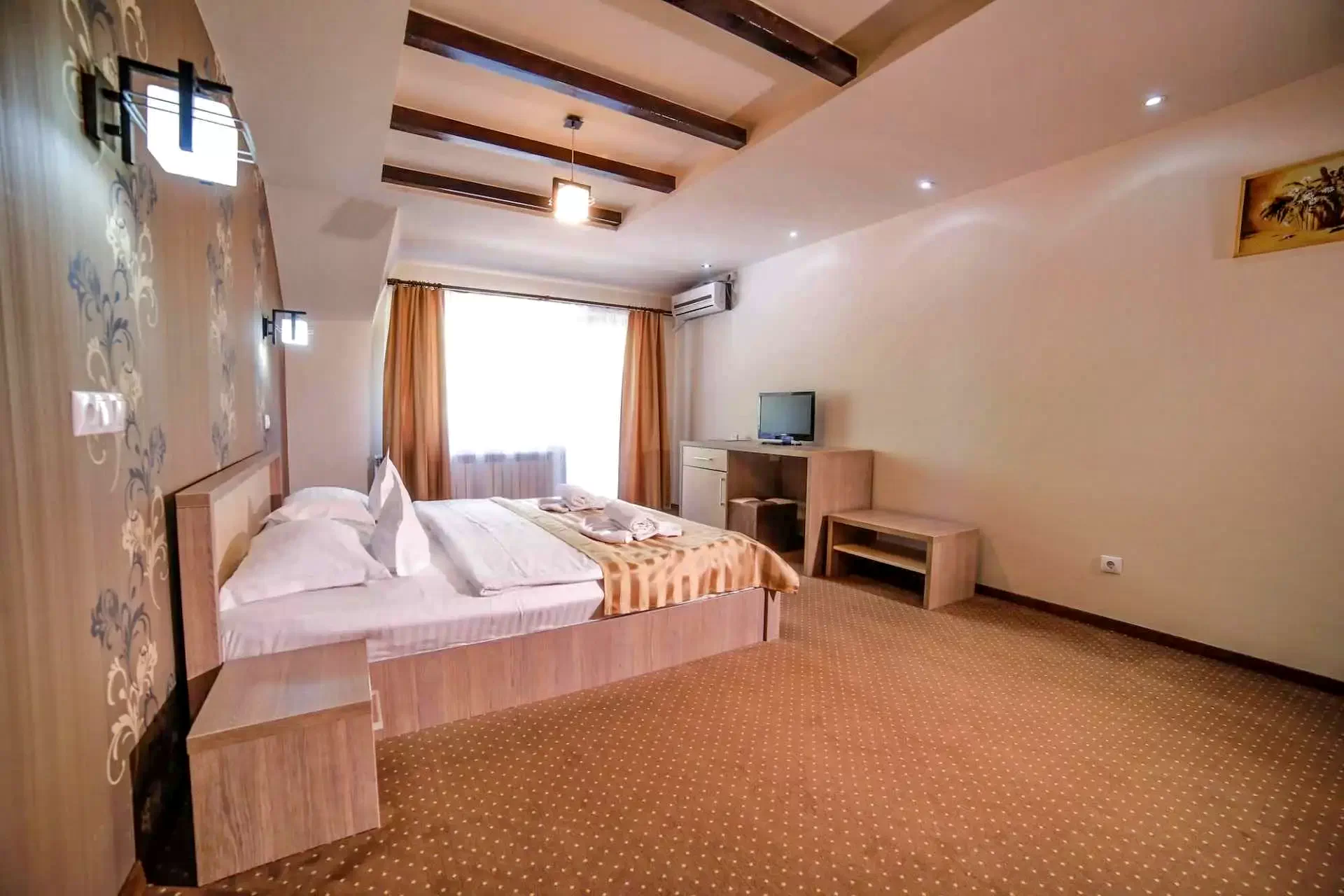Cu o suprafață de 2000 de metri pătrați de parc amenajat, oferă cazare în 16 camere spațioase și luxoase, cu aer condiționat, pentru 32 de persoane, cu vedere panoramică la munții din jur. Facilitățile includ piscine interioare și exterioare, un restaurant excelent, săli de conferințe.