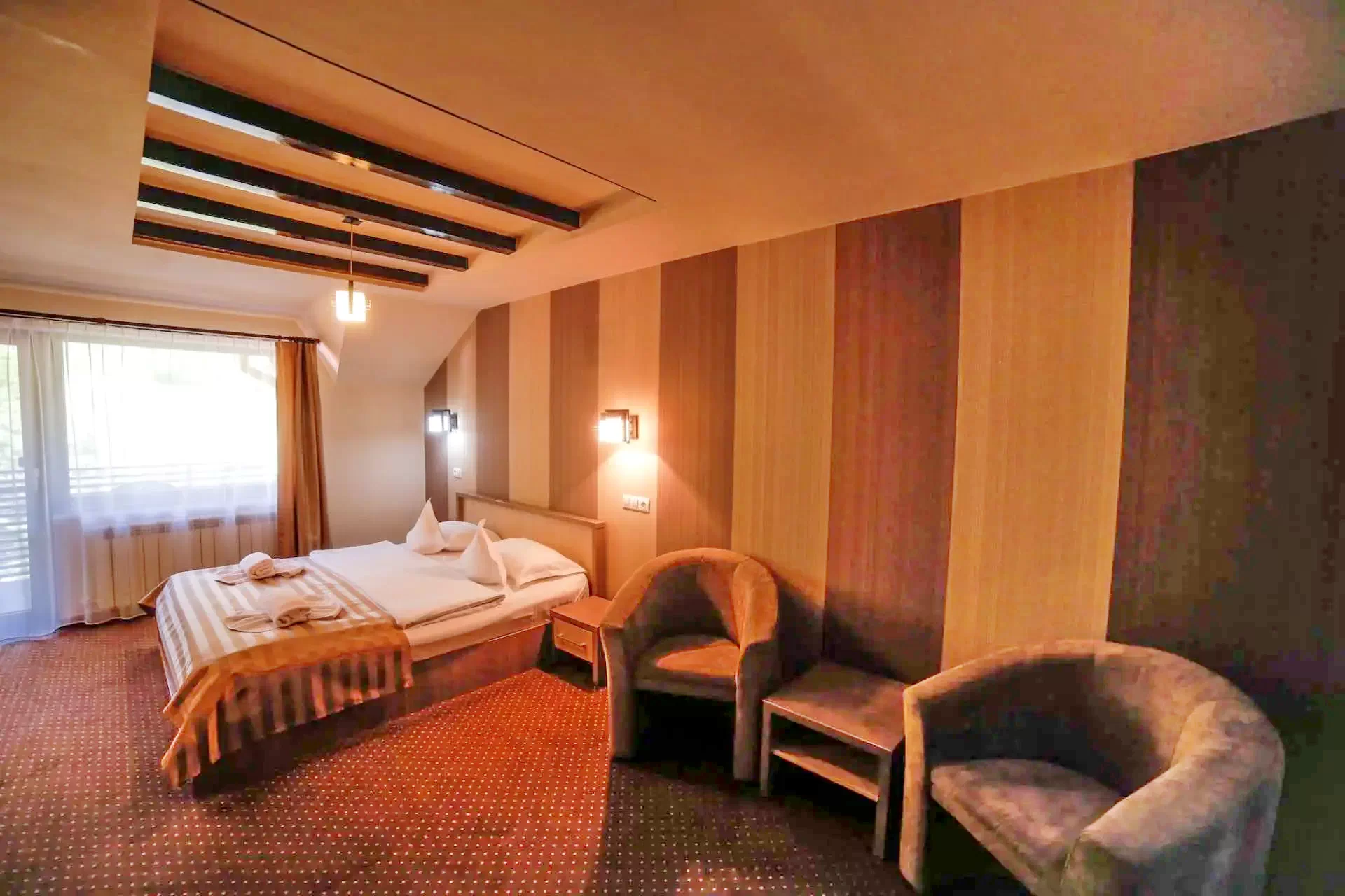 Vă punem la dispoziție camera duble de 3 stele, camera duble de lux cu pat matrimonial și apartamente cu jacuzzi de 4 stele, bază de tratament balnear, restaurant a la carte, bar și terasă, piscină cu apă încălzită, bazin cu apă termo-sulfuroasă, cada cu hidromasaj în aer liber cu apă salină încălzită, saună, grădină cu foișor, loc de joacă pentru copii, livadă cu pomi fructiferi, hamac, sală de sport și sală de conferințe.