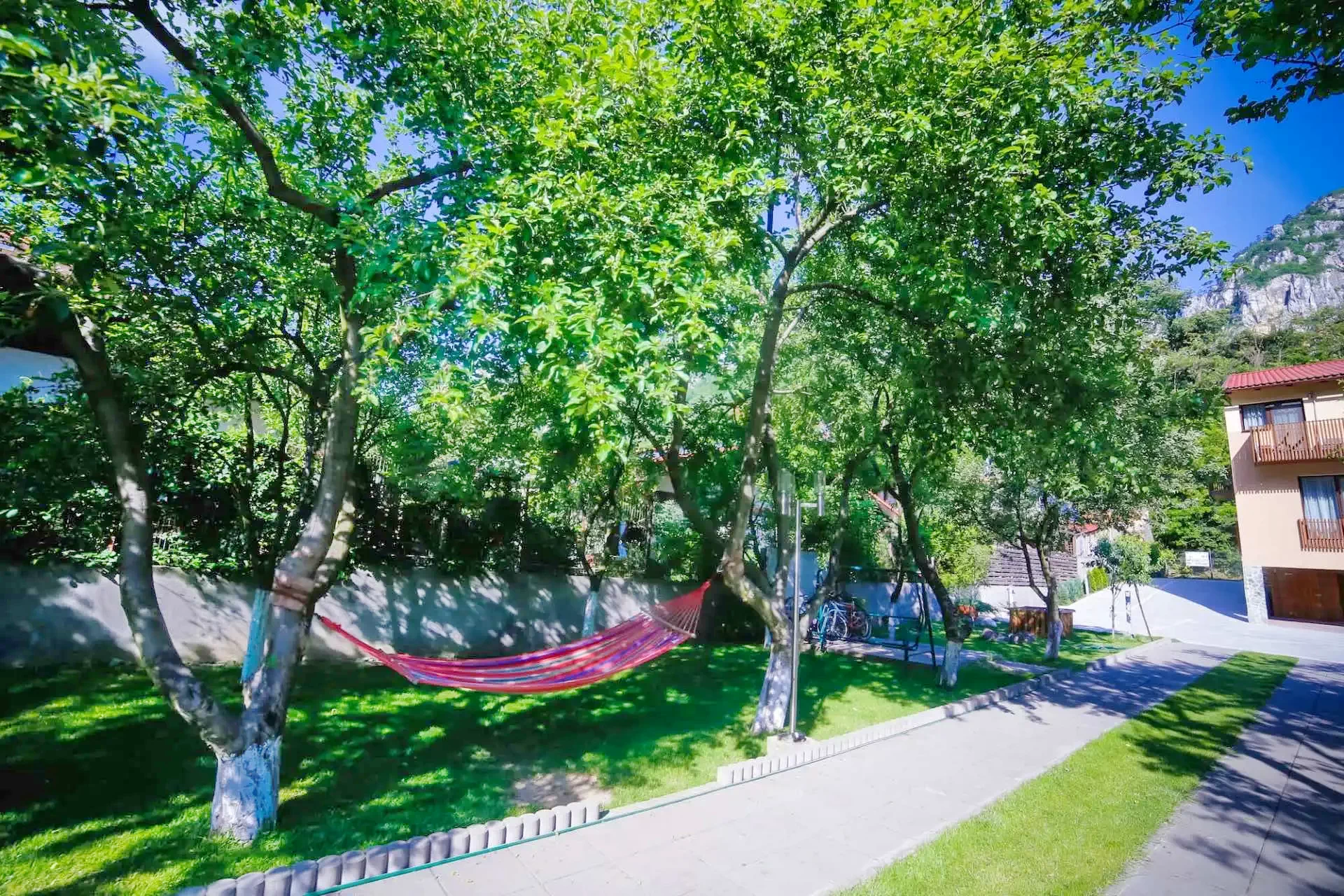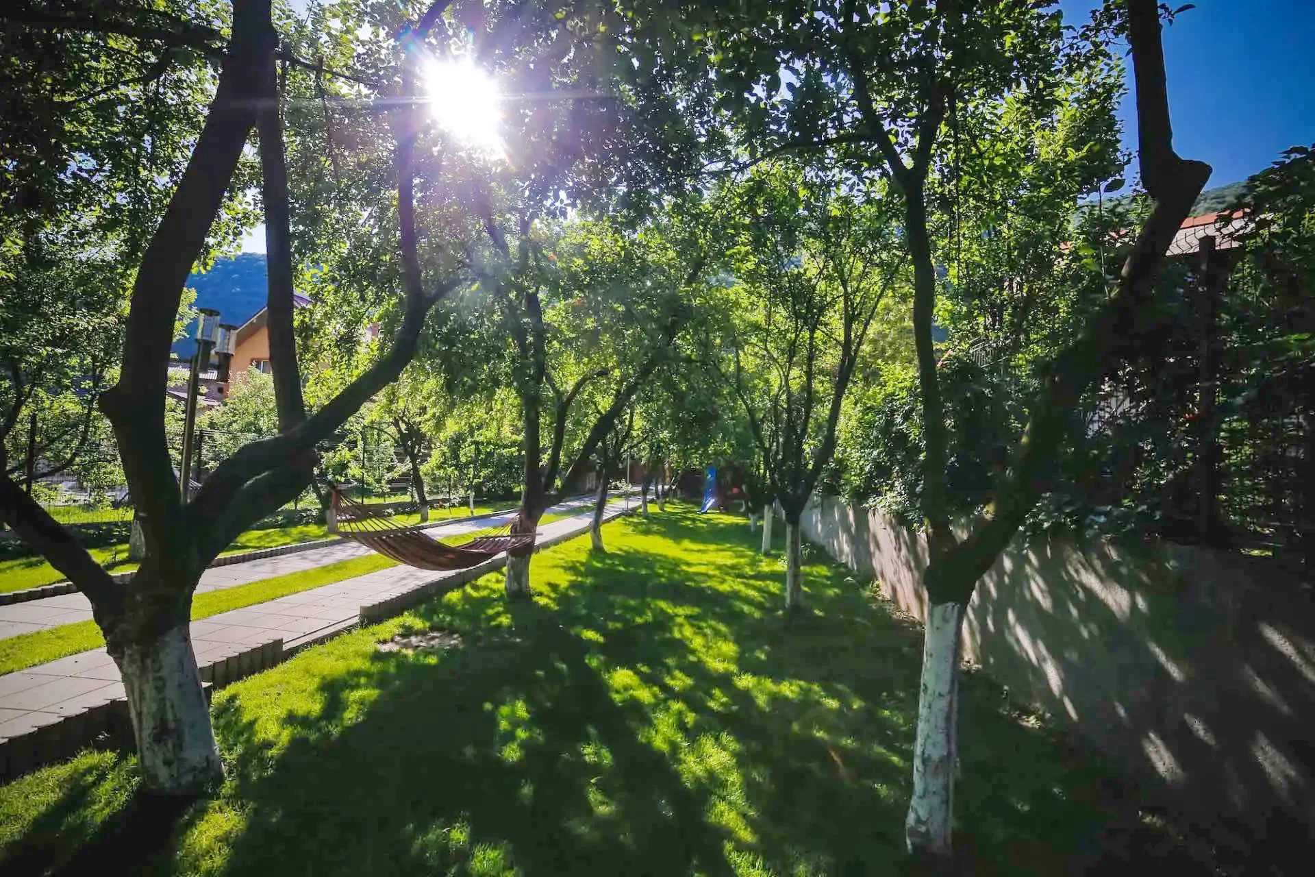 - Livada cu pomi fructiferi, gazon si hamac