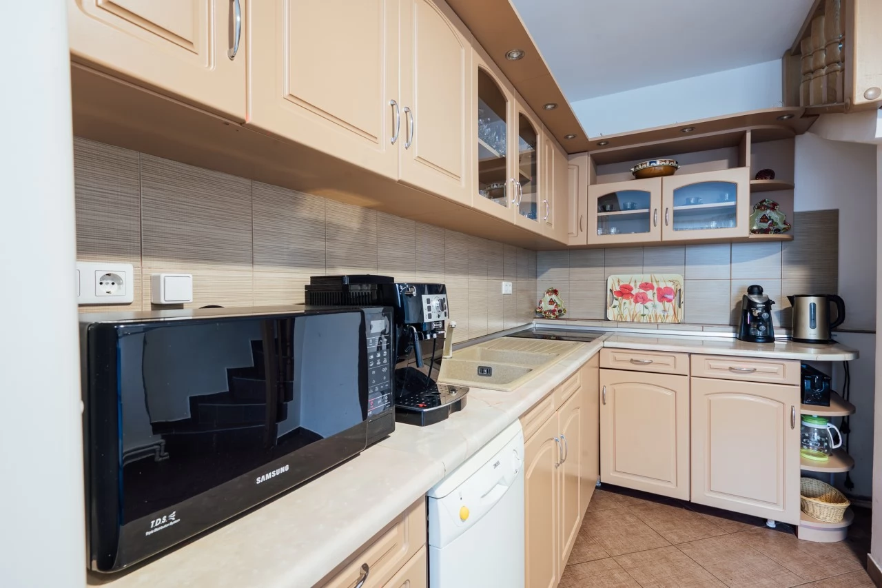 Bucătărie utilată (mașină de spălat vase, cuptor cu microunde, espressor, aragaz pe gaz, frigider).