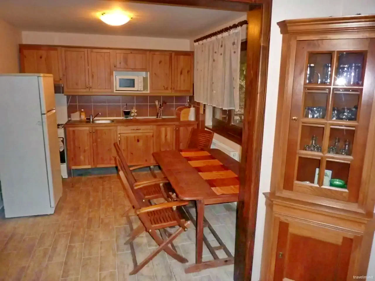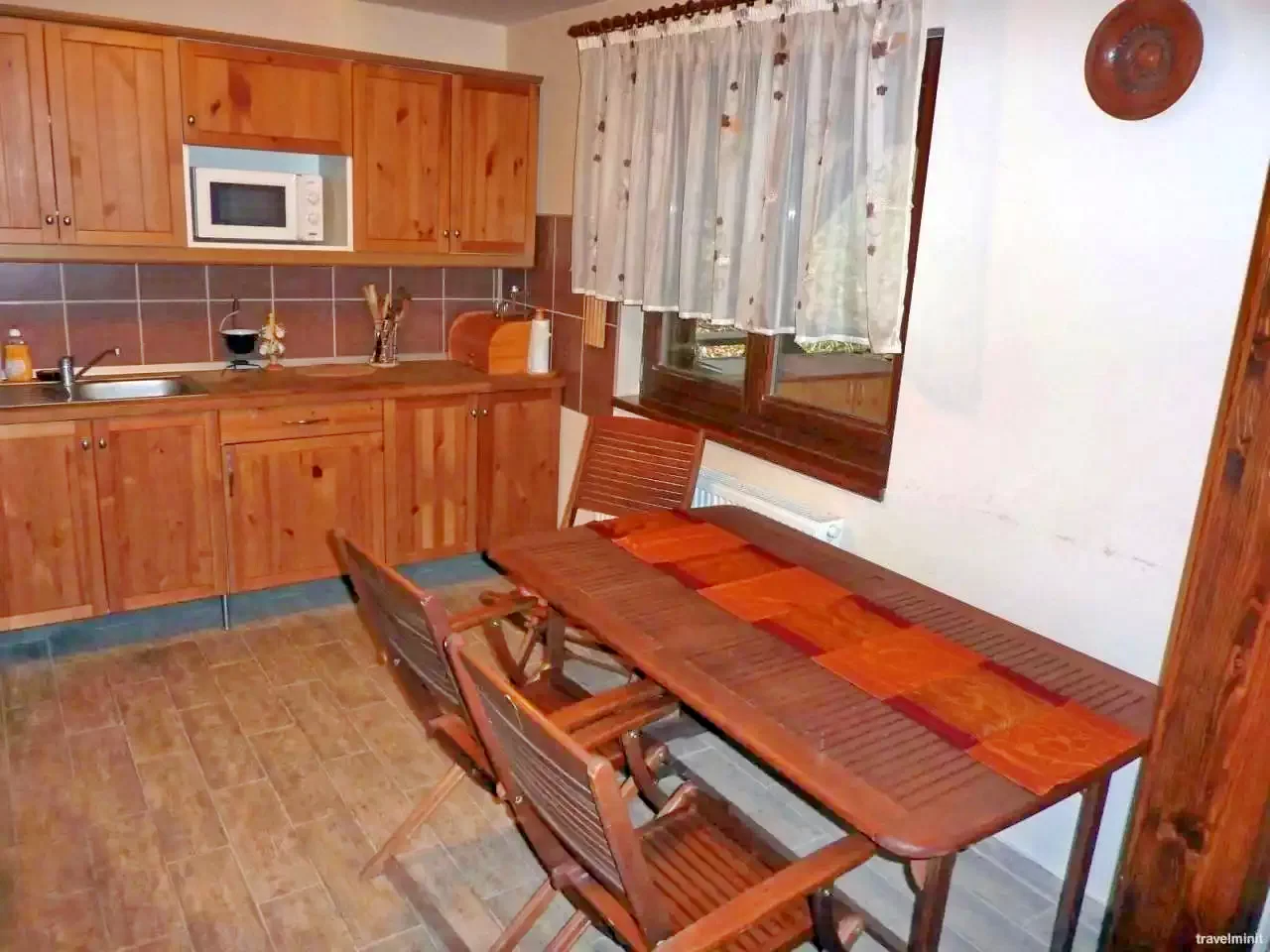 Bucătărie: Aragaz pe gaz, frigider, cuptor cu microunde, prăjitor de pâine, filtru de cafea, fierbător de ceai, oale, tacâmuri.