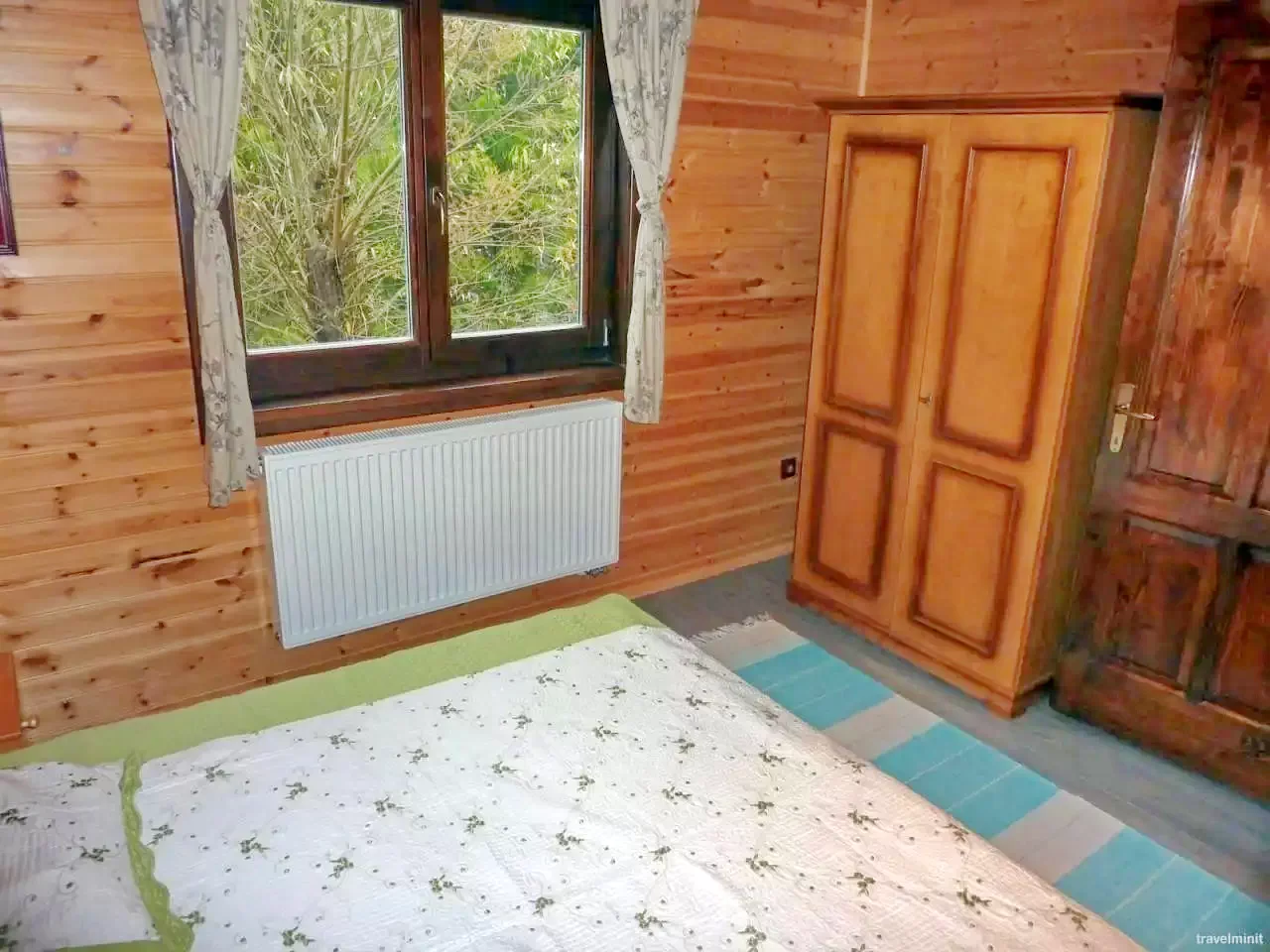 - La etaj se află trei camere și o baie (cu duș, WC și chiuvetă): o cameră cu un pat dublu (2 persoane) și alte două camere cu câte două paturi de o persoană (4 persoane).