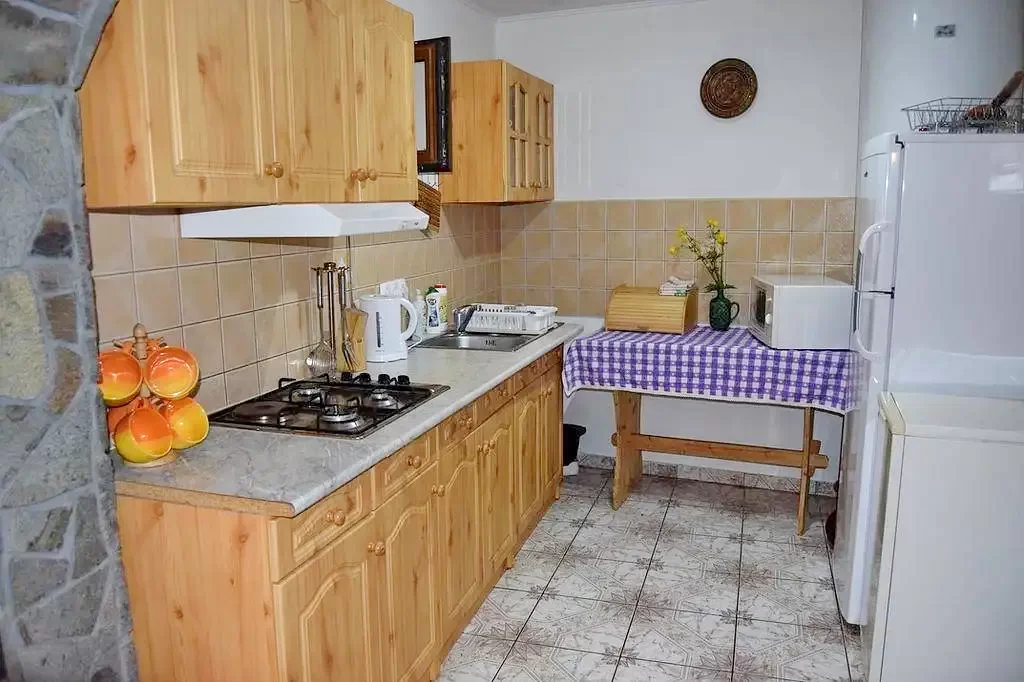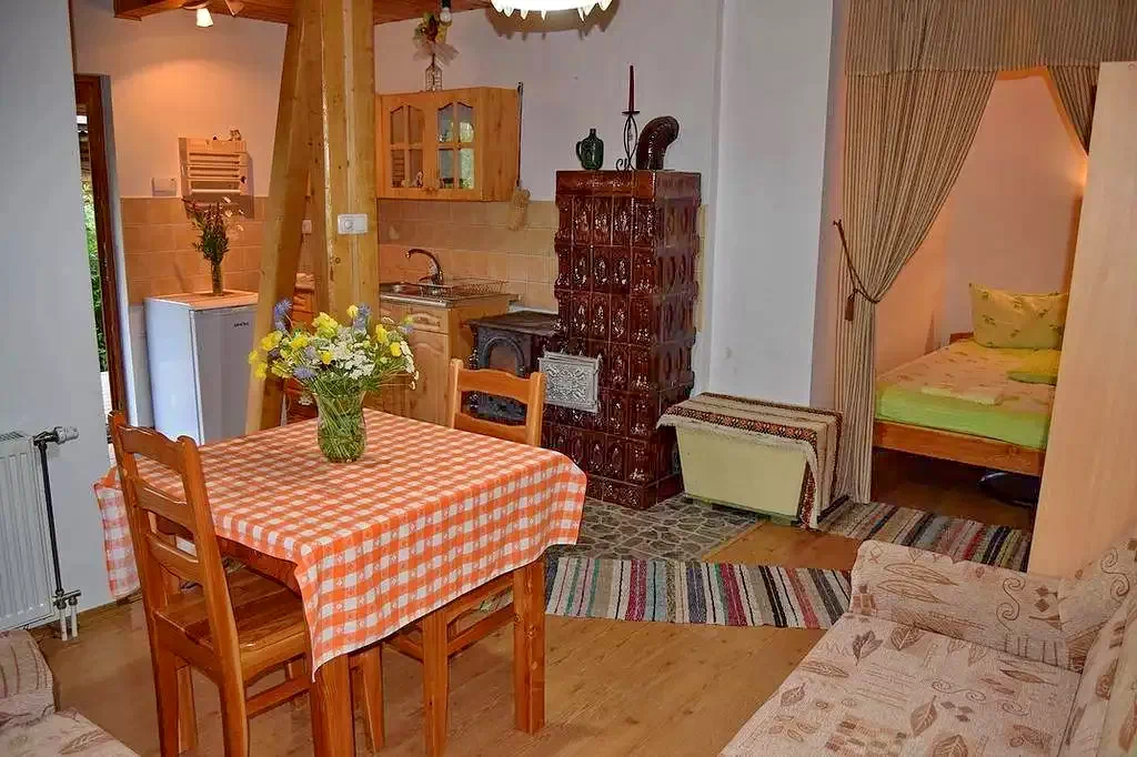 A doua aripă – Apartament: bucătărie, living mic (colțar extensibil, TV), dormitor, baie, sobă pe plăci ceramice