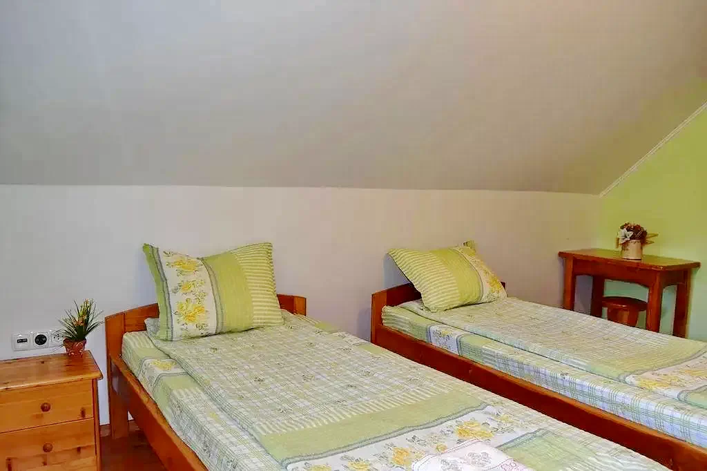 - Pensiunea dispune de două aripi separate, cu intrări independente, oferind 15 locuri în 5 camere și 3 băi.