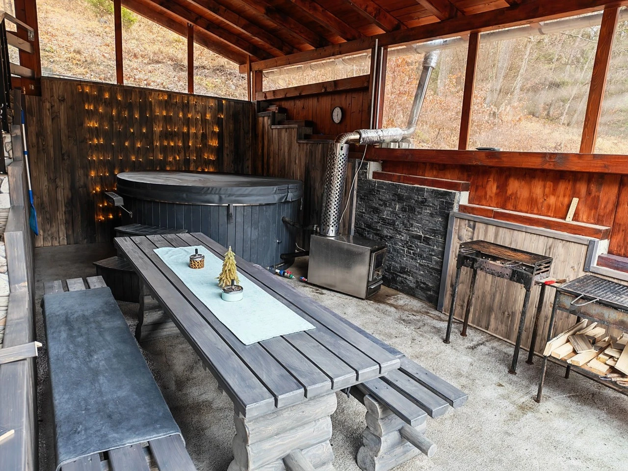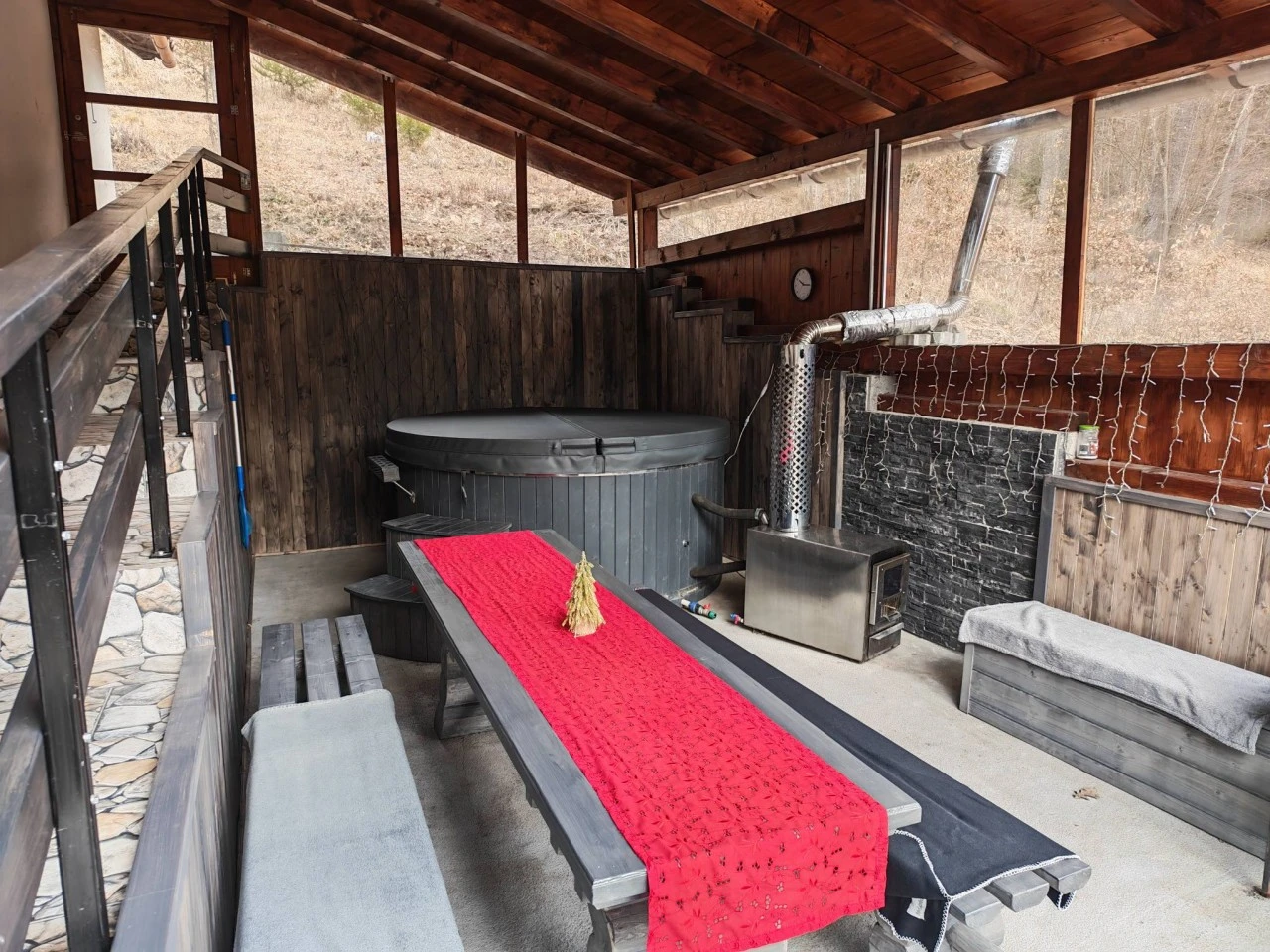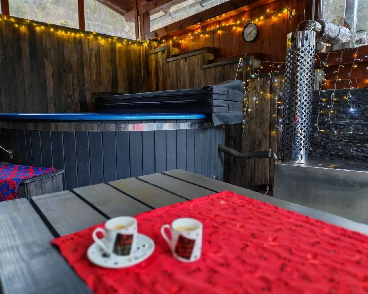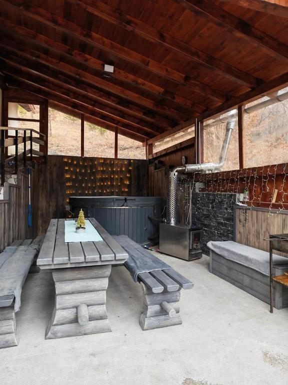 Una dintre atracțiile principale ale casei este Ciubarul cu hidromasaj în aer liber din fibră de sticlă, perfectă pentru relaxare după drumeții montane.