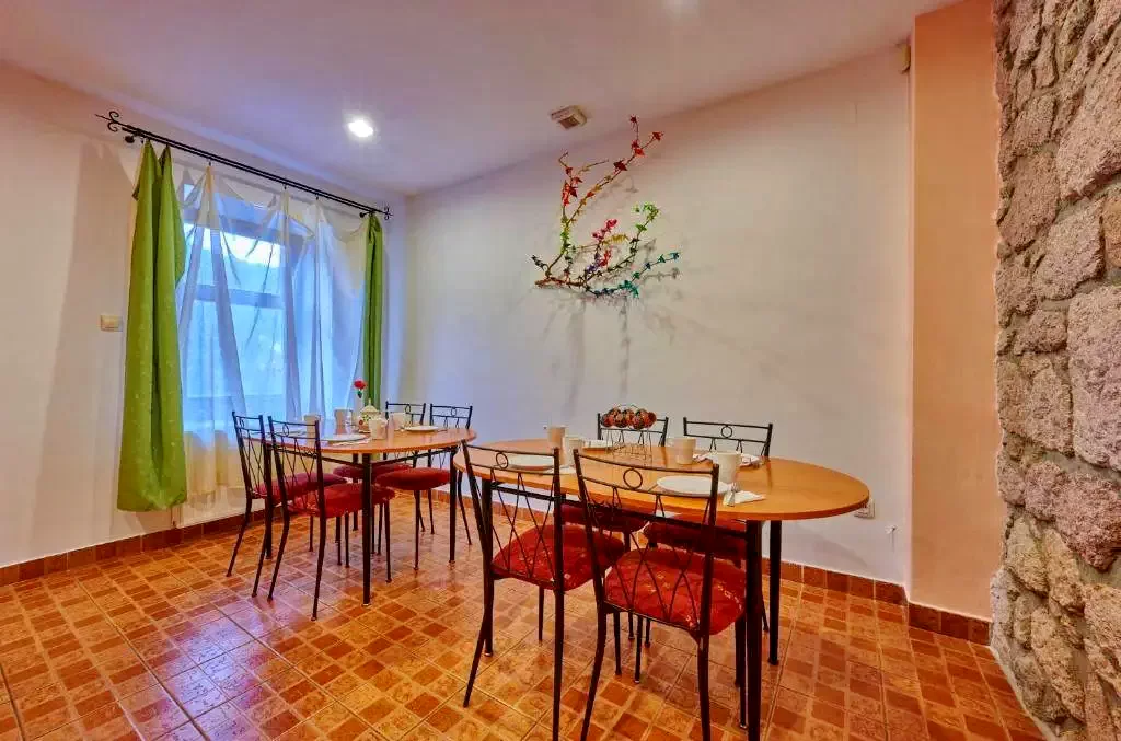 - Pensiunea oferă o sală de mese spațioasă cu 40 de locuri și o bucătărie complet utilată (frigider, aragaz, cuptor cu microunde, mașină de spălat vase, ustensile de bucătărie), perfectă pentru prepararea propriilor mese, de la mic dejun la cine festive.
