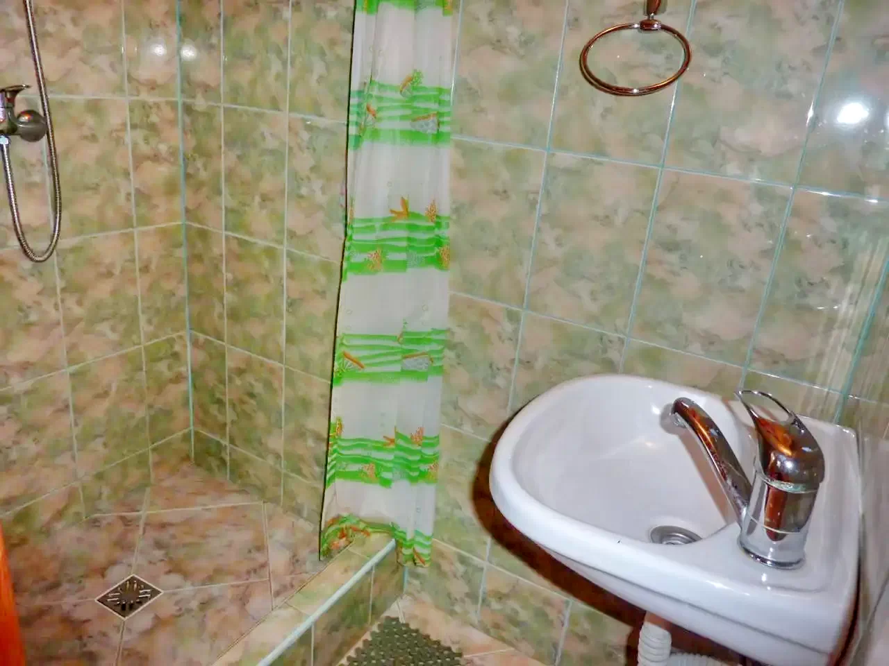 - La parter se află livingul-sufragerie, bucătăria complet utilată, o baie separată (duș + chiuvetă) și un WC separat (WC + chiuvetă).