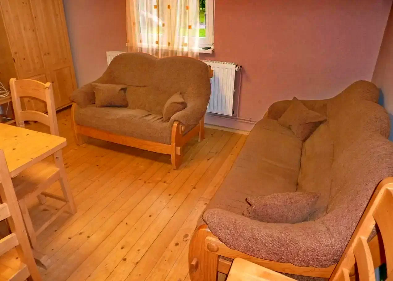 - La parter se află un living-sala de mese cu o canapea extensibilă pentru 2 persoane, o bucătărie modernă și două băi (ambele cu duș, WC și chiuvetă).