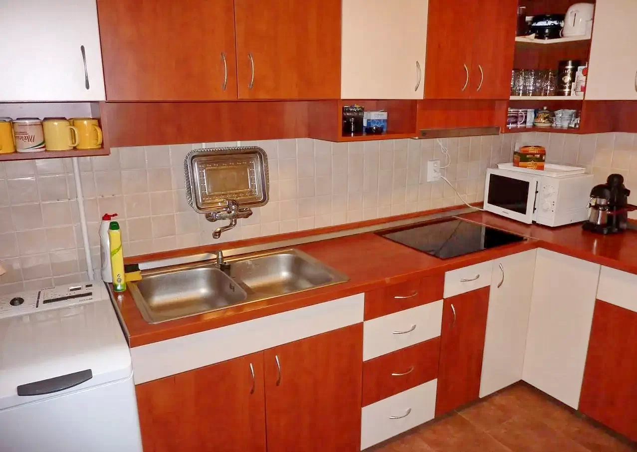 Bucătărie: Aragaz pe gaz și plită electrică, frigider, cuptor cu microunde, prăjitor de pâine, filtru de cafea, fierbător de ceai, oală sub presiune, vase, tacâmuri.