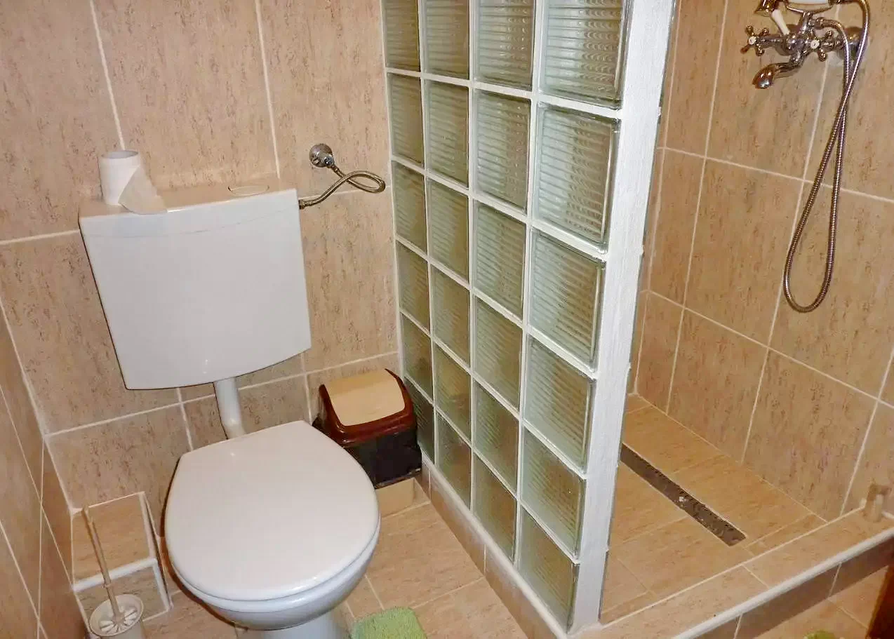 Living-sala de mese (cu canapea extensibilă pentru 2 persoane), bucătărie, două băi (duș, WC, chiuvetă).