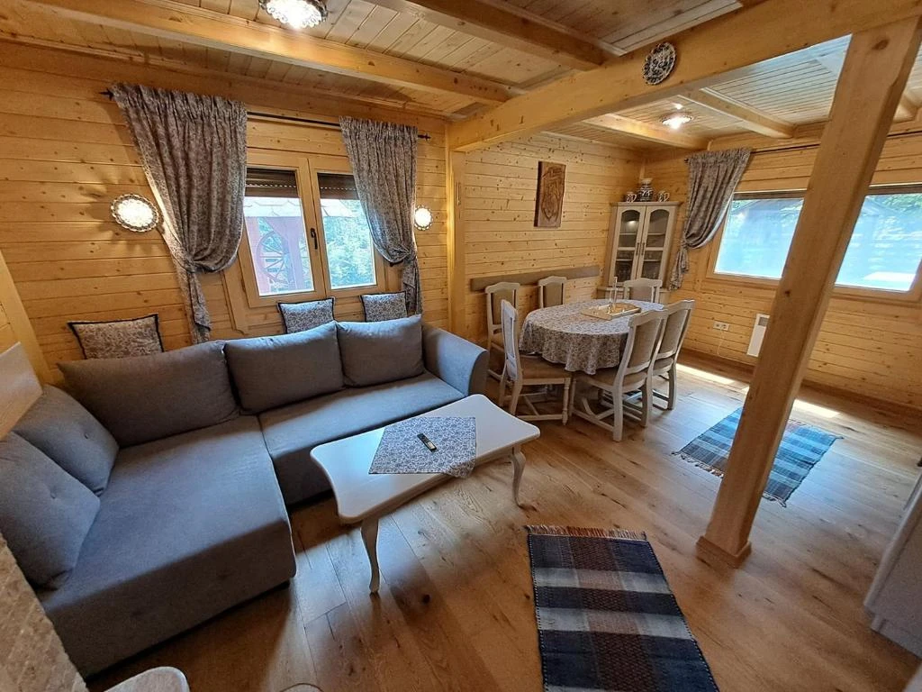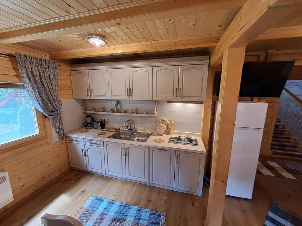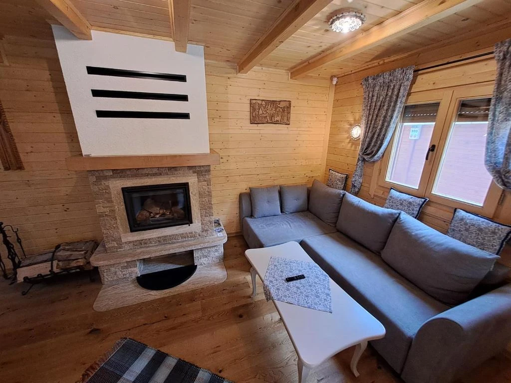 - La parter se află un living spațios cu șemineu, Smart TV și WiFi, o bucătărie complet utilată și o baie (cu cadă de duș, WC și chiuvetă). În living, un fotoliu extensibil poate găzdui două persoane suplimentare.