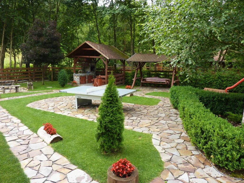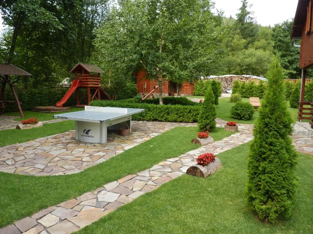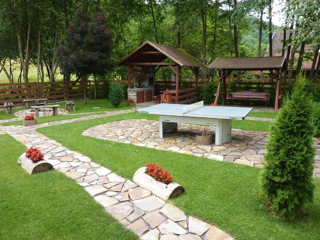 - Curtea de 900 m² oferă numeroase activități: foișor acoperit, terasă pe malul pârâului, leagăn, lipinka, tobogan, masă de ping-pong, șezlonguri, precum și teren de volei și tenis cu piciorul.