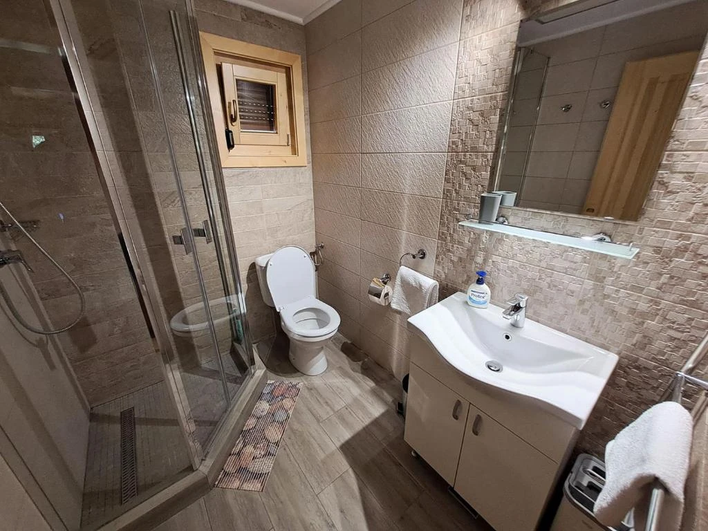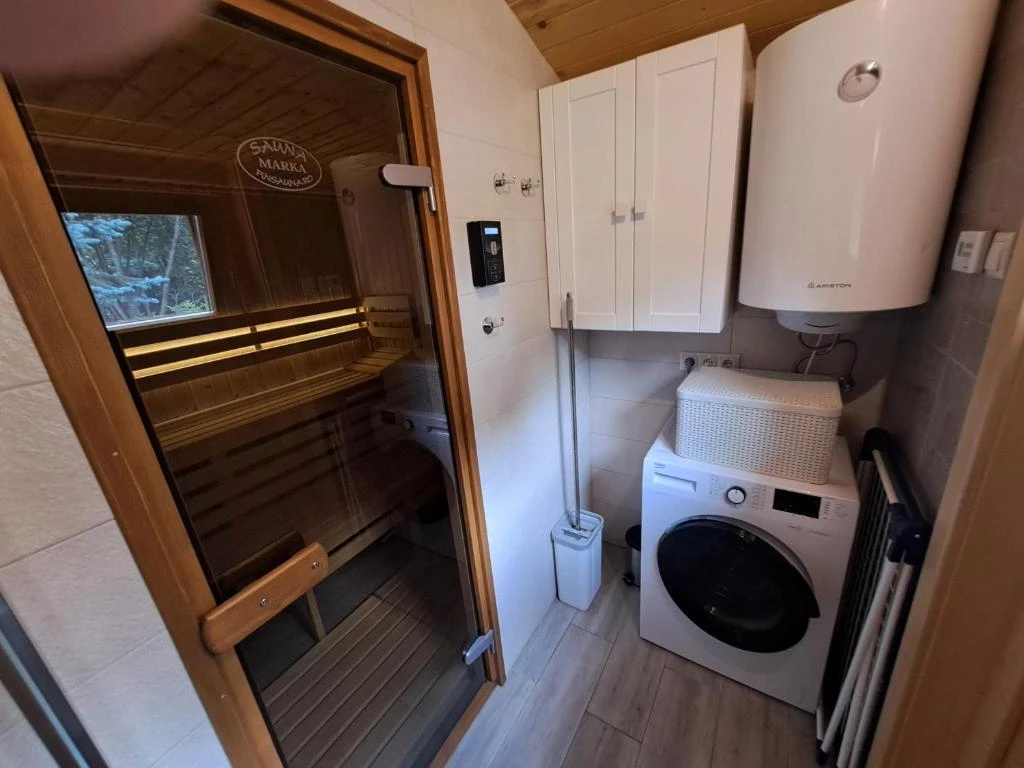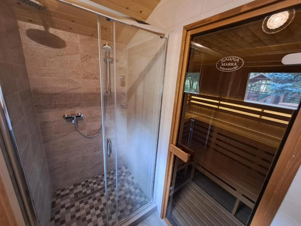 - La etaj sunt trei camere elegante pentru oaspeți și o a doua baie, fiecare cameră fiind dotată cu Smart TV și WiFi. Toate încăperile sunt încălzite individual cu șemineu, radiatoare electrice și panouri cu infraroșu, asigurând confort în orice anotimp.