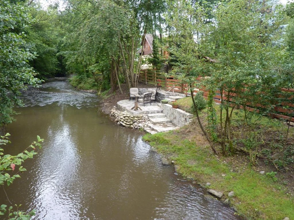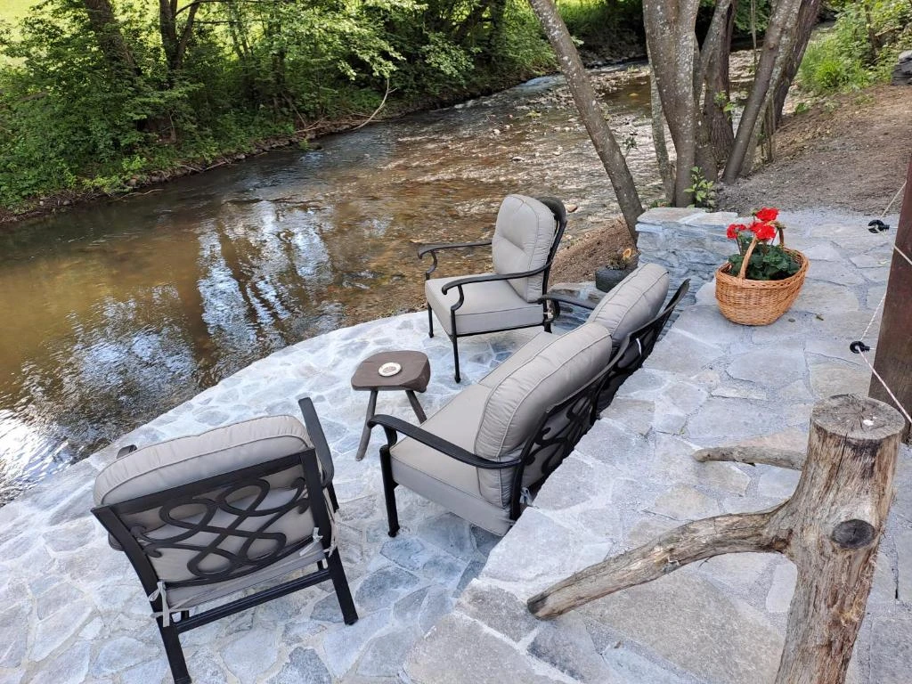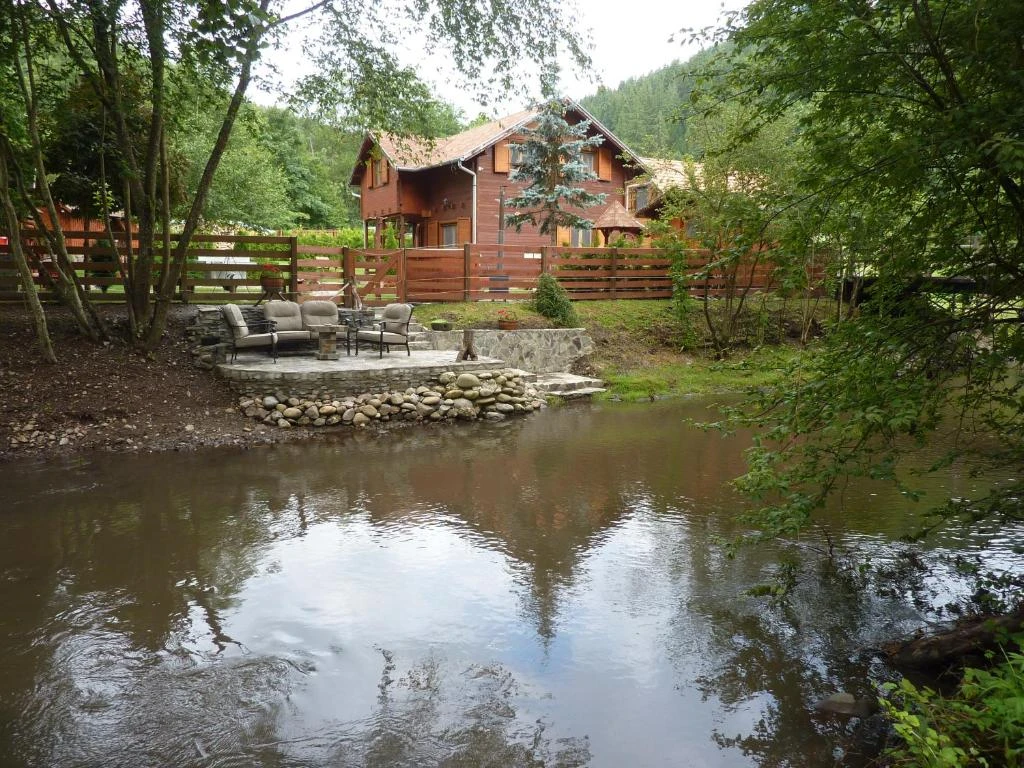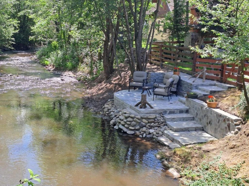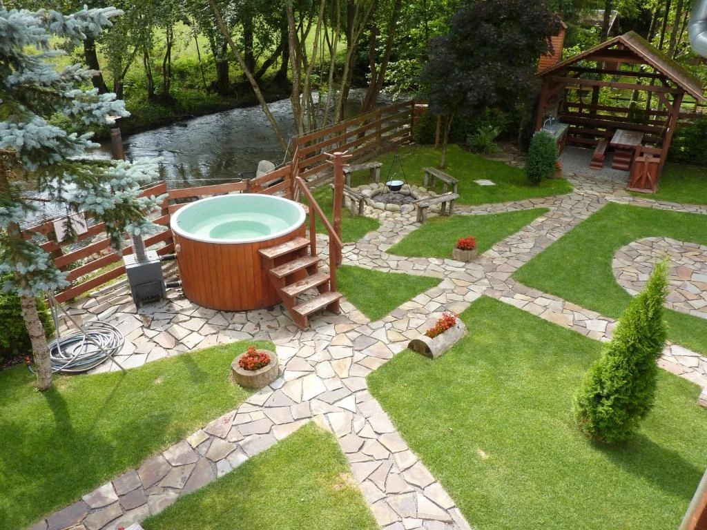 Curtea de 900 m², împrejmuită, oferă terase pe malul pârâurilor, facilități de wellness și activități de agrement.
