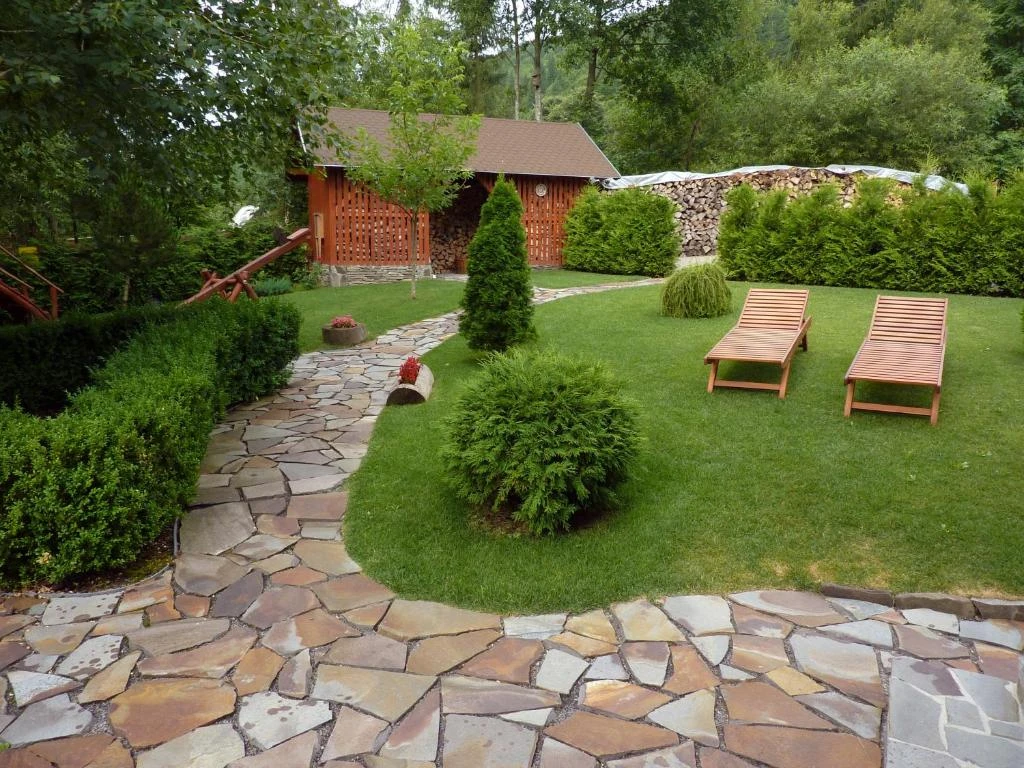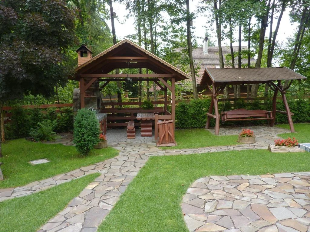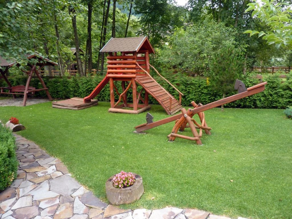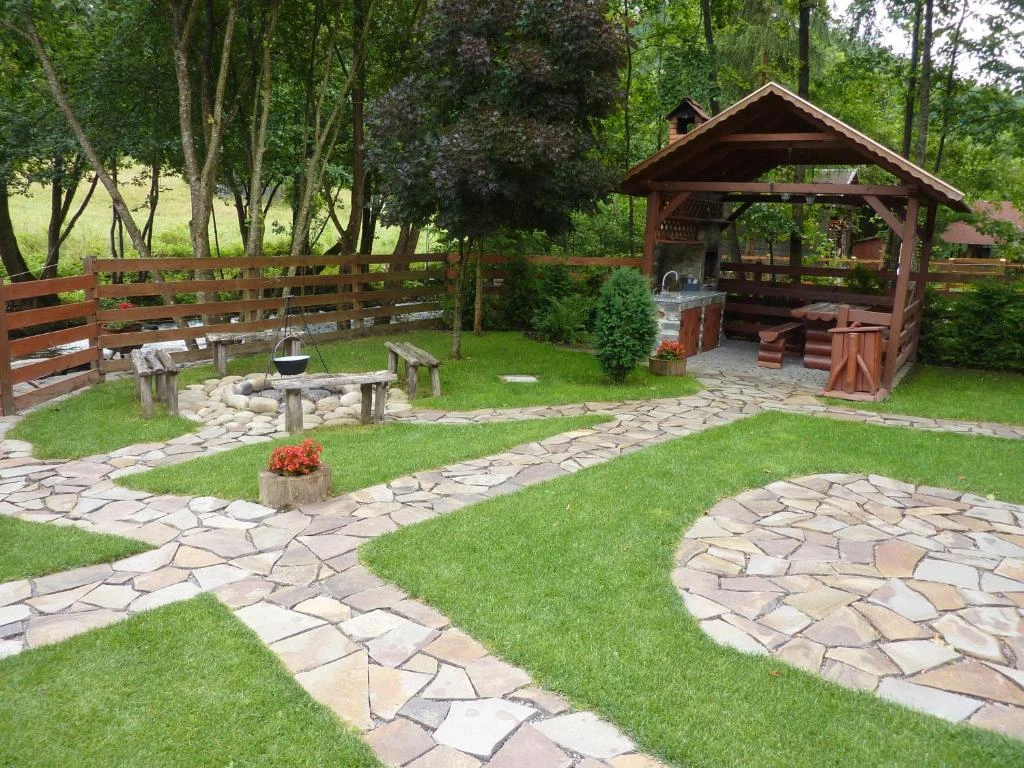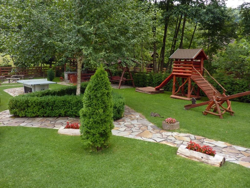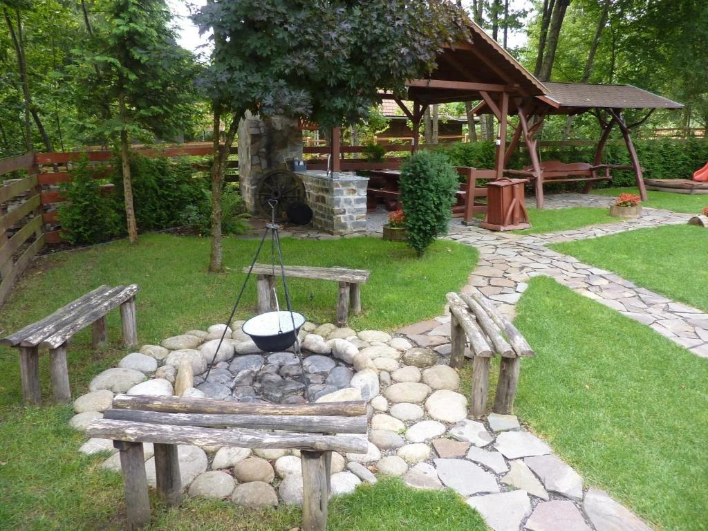 Relaxare: Foisor acoperit, terasă pe malul pârâului, șezlonguri, leagăn, lipinka, tobogan.