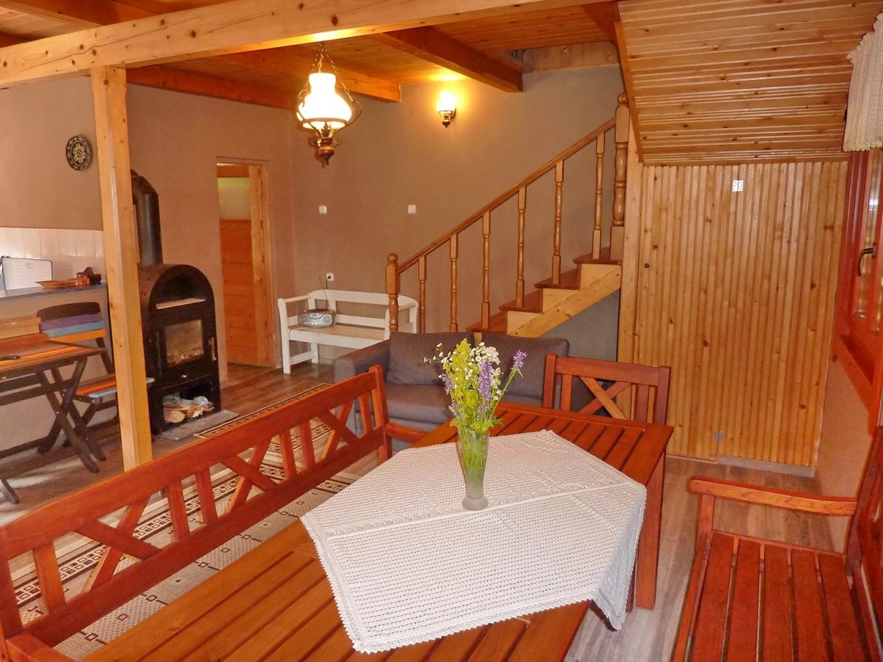 - La etaj sunt trei camere, fiecare cu două paturi single. Încălzirea este asigurată de un șemineu, iar apa caldă de un boiler electric, garantând confort în orice anotimp.