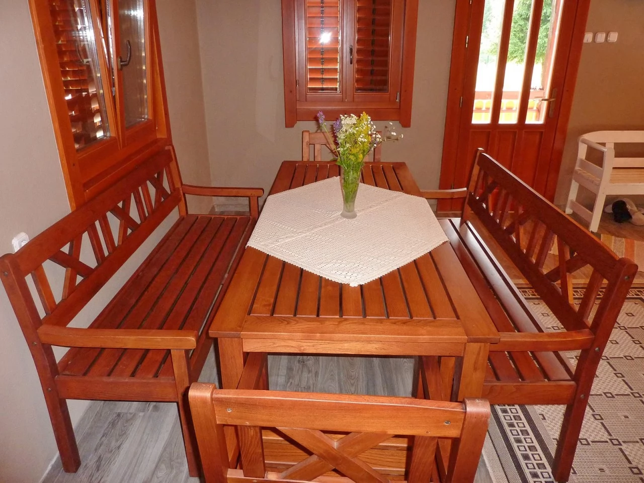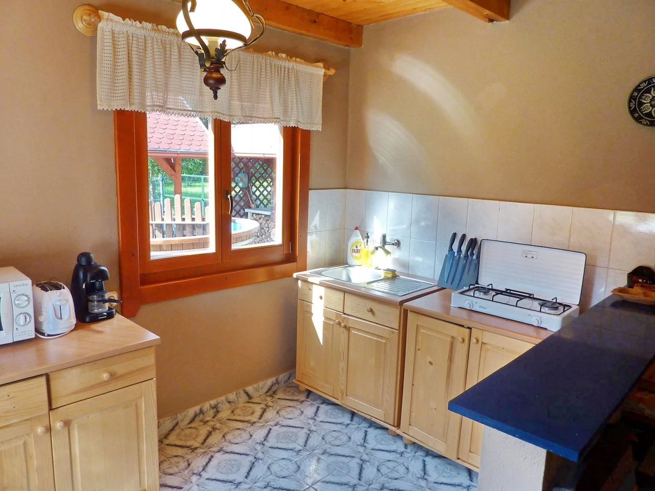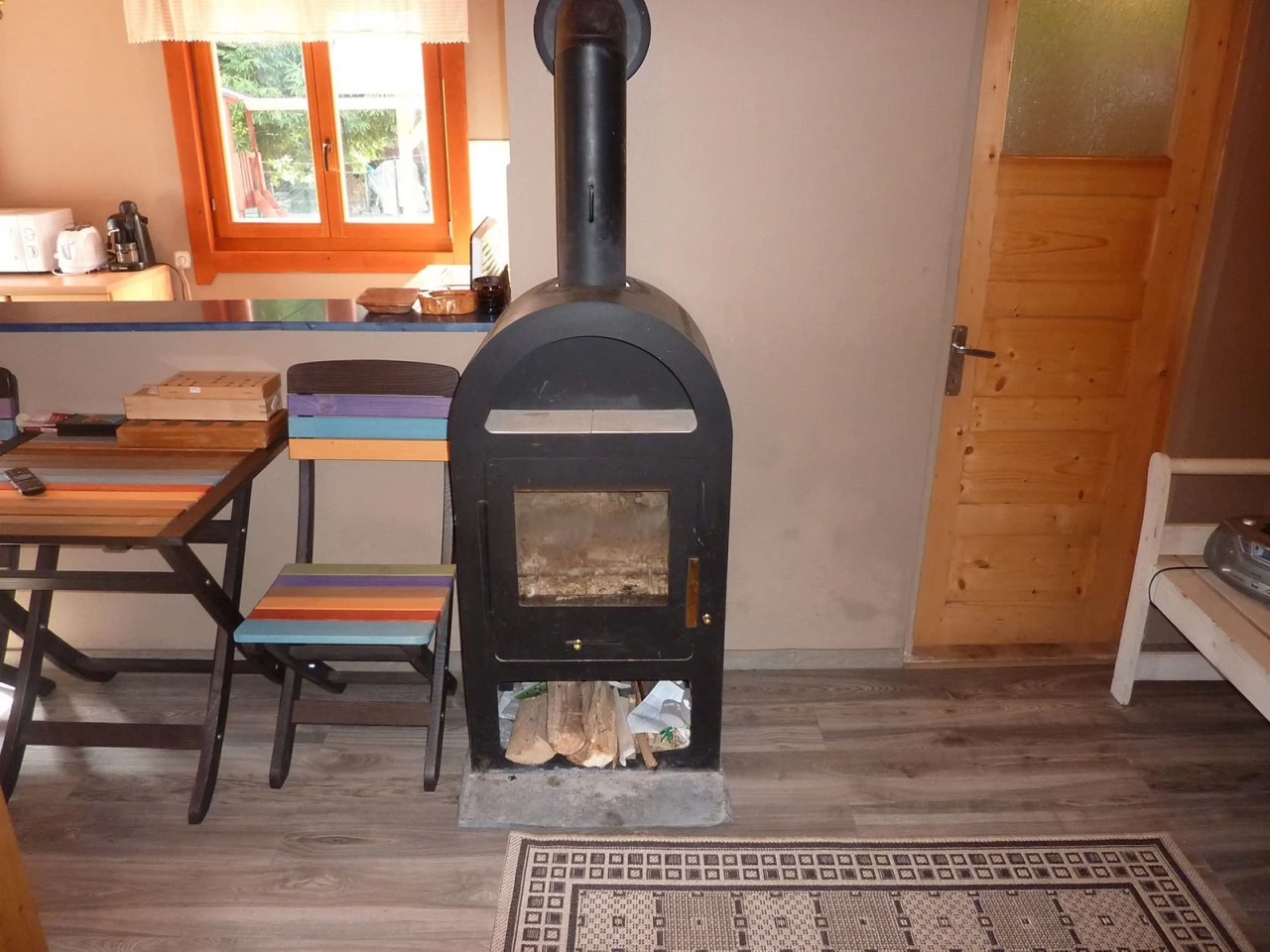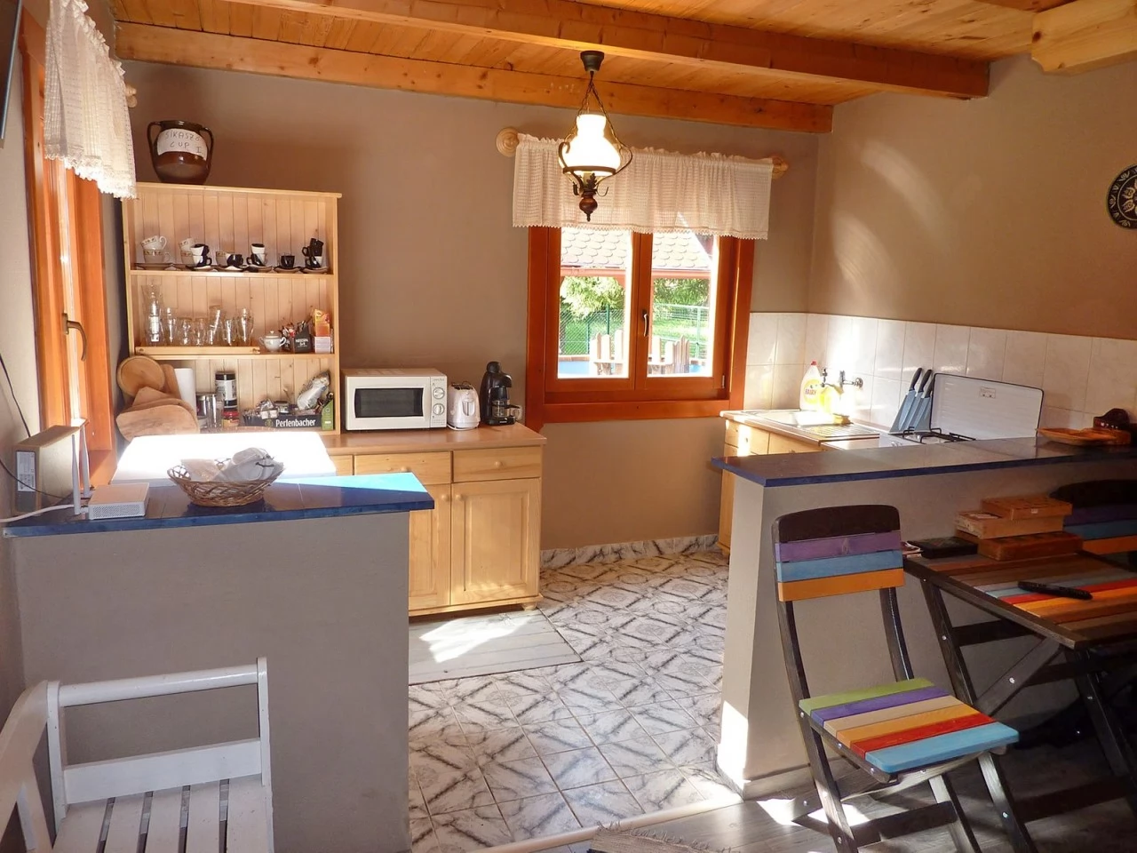 La parter se află un living cu fotoliu extensibil, o sufragerie, o bucătărie complet utilată și o baie (cu duș, WC și chiuvetă).