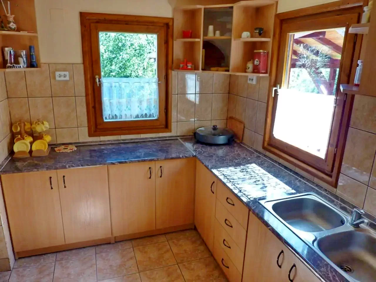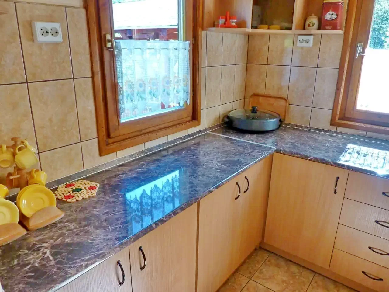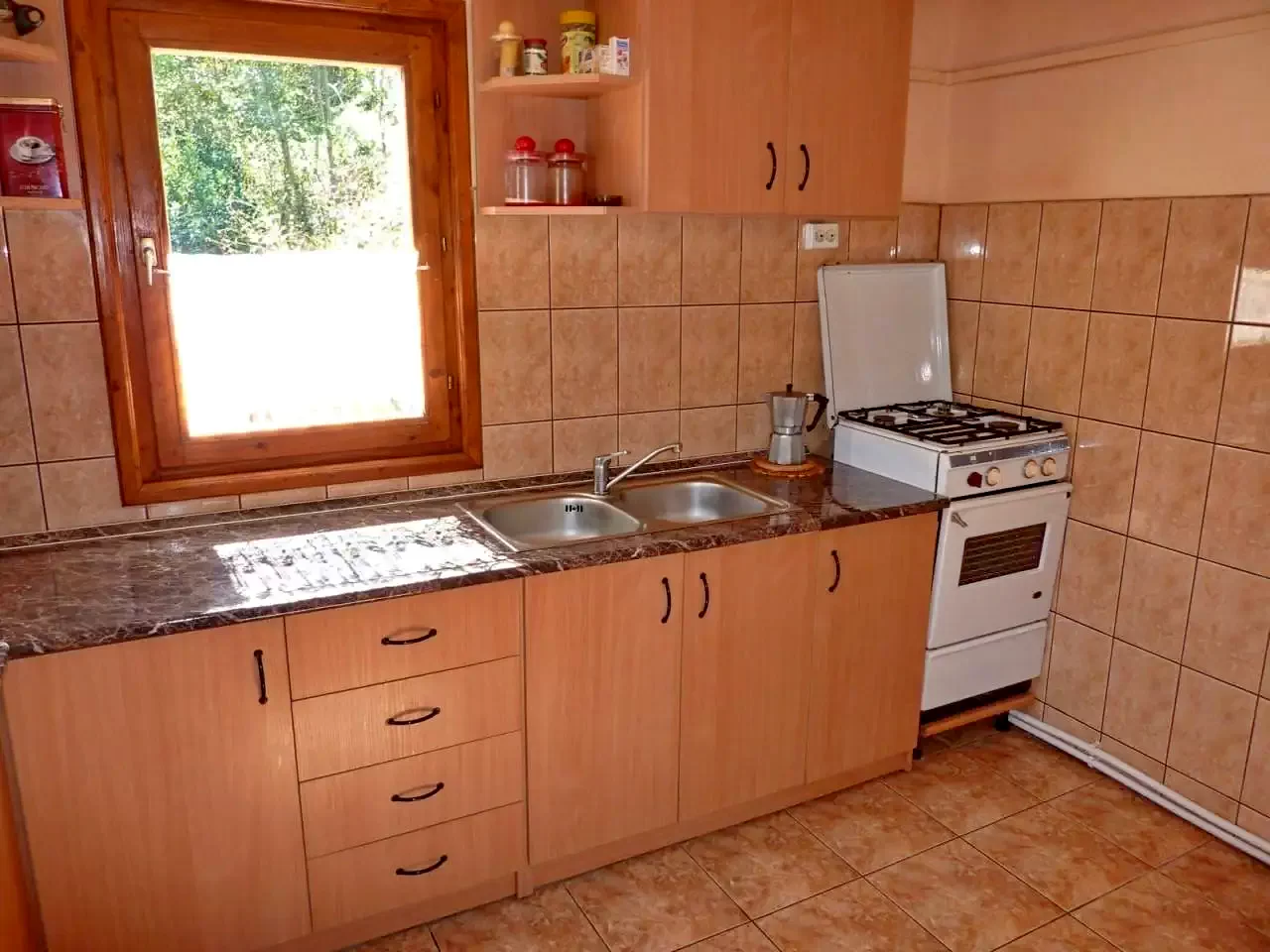 - Bucătărie complet echipată (aragaz pe gaz, frigider, cafetieră, vase, tacâmuri)