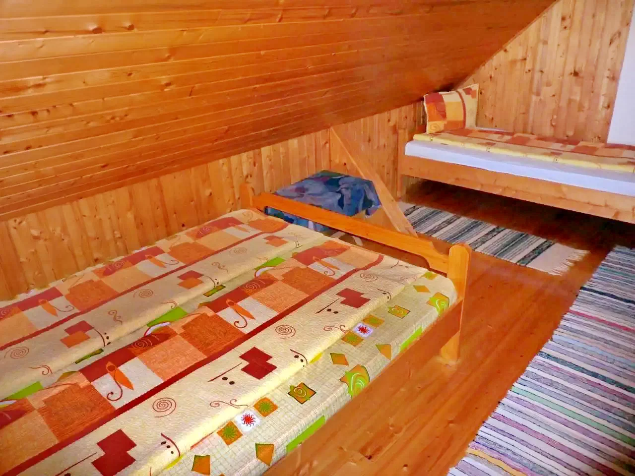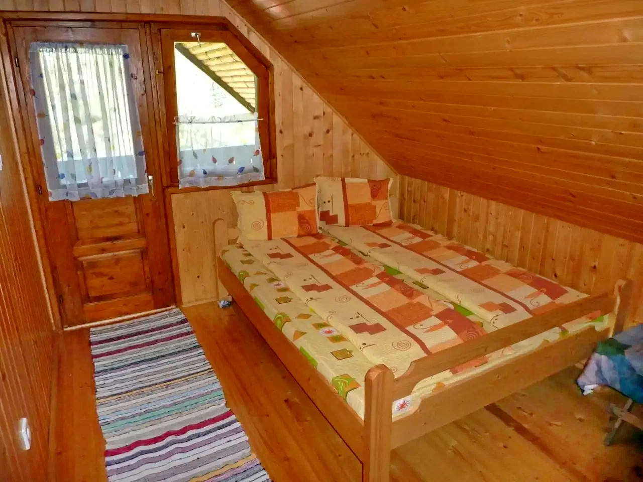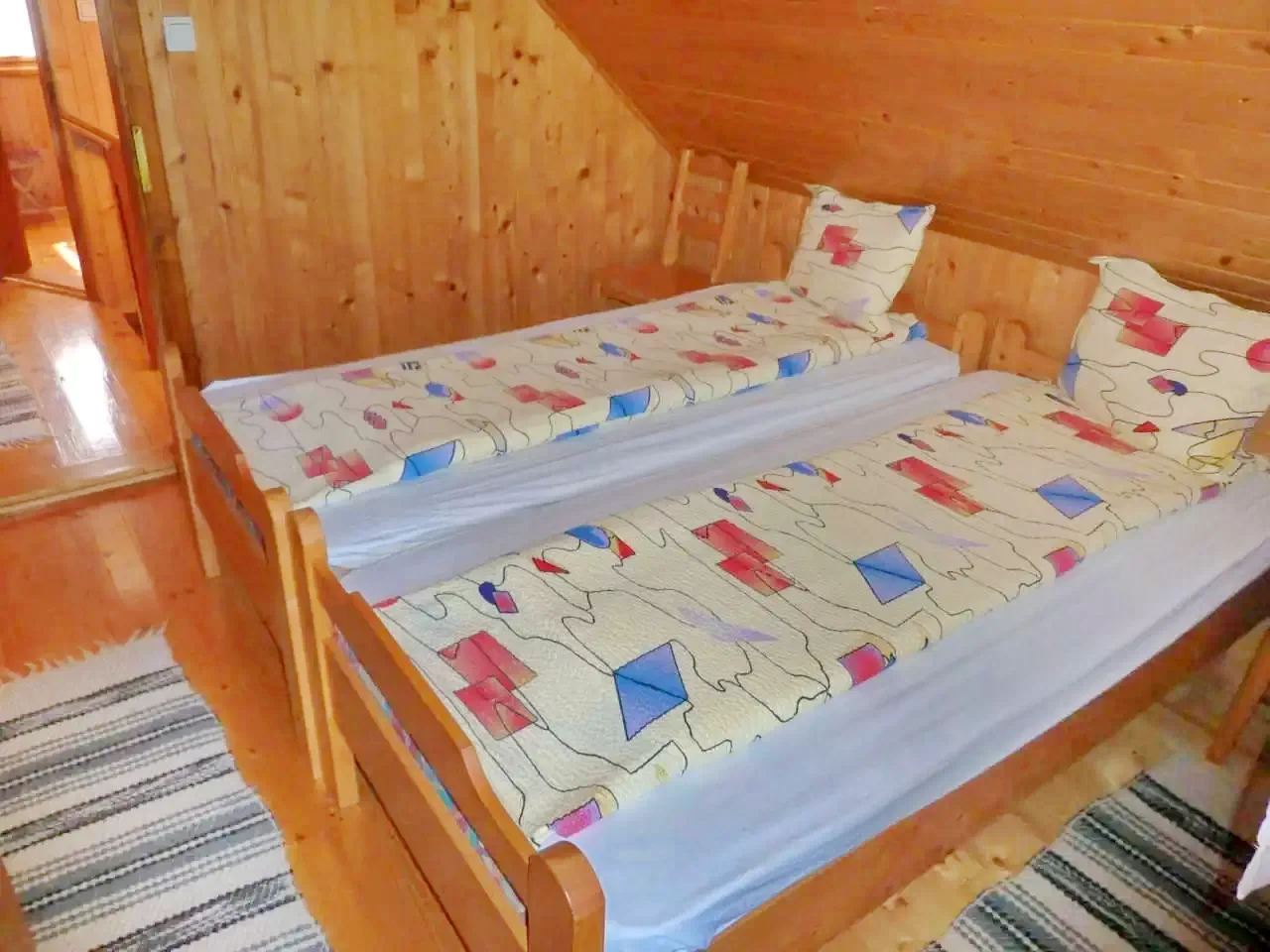- La etaj, oaspeții sunt întâmpinați de patru camere mansardate primitoare: două camere cu câte un pat dublu, una cu un pat simplu, iar ultima cu un pat dublu și un pat simplu.