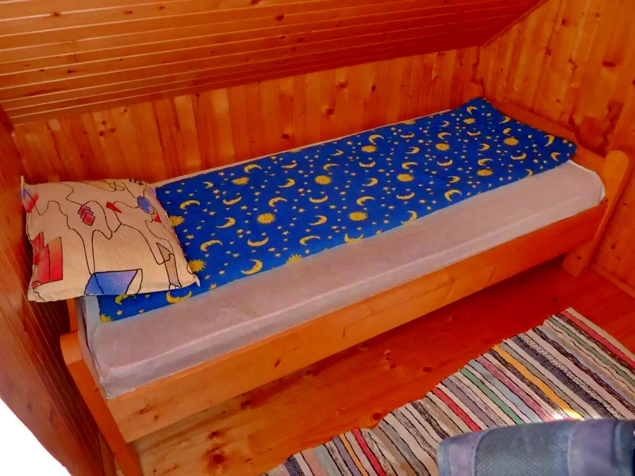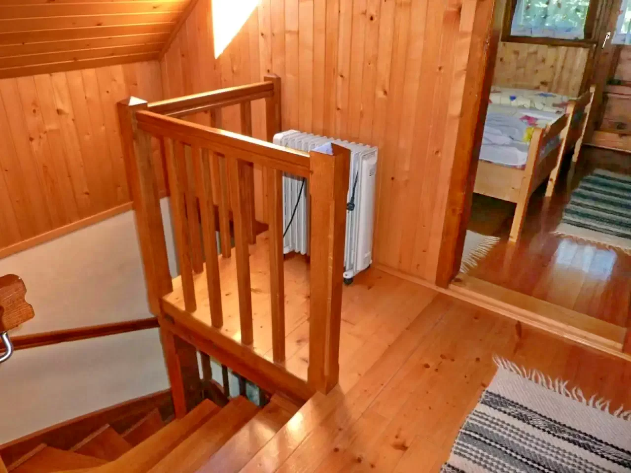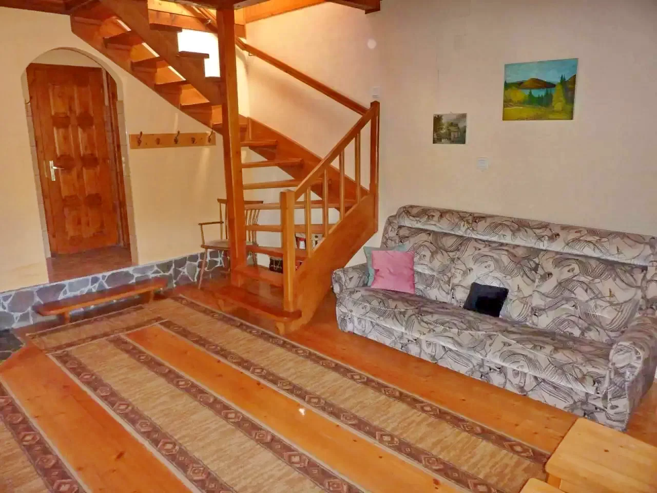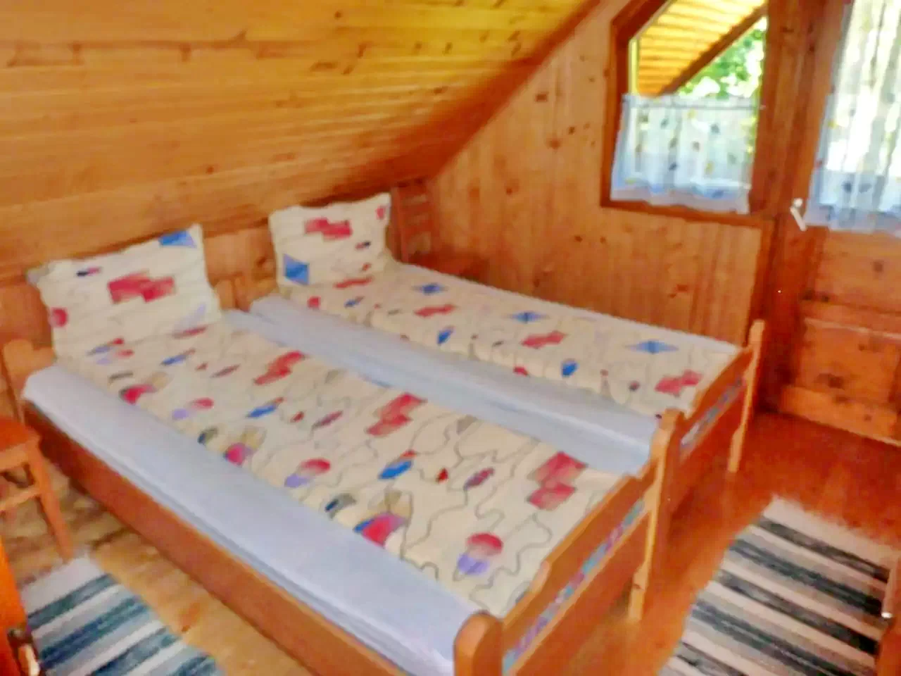 - La etaj, oaspeții sunt întâmpinați de patru camere mansardate primitoare: două camere cu câte un pat dublu, una cu un pat simplu, iar ultima cu un pat dublu și un pat simplu.