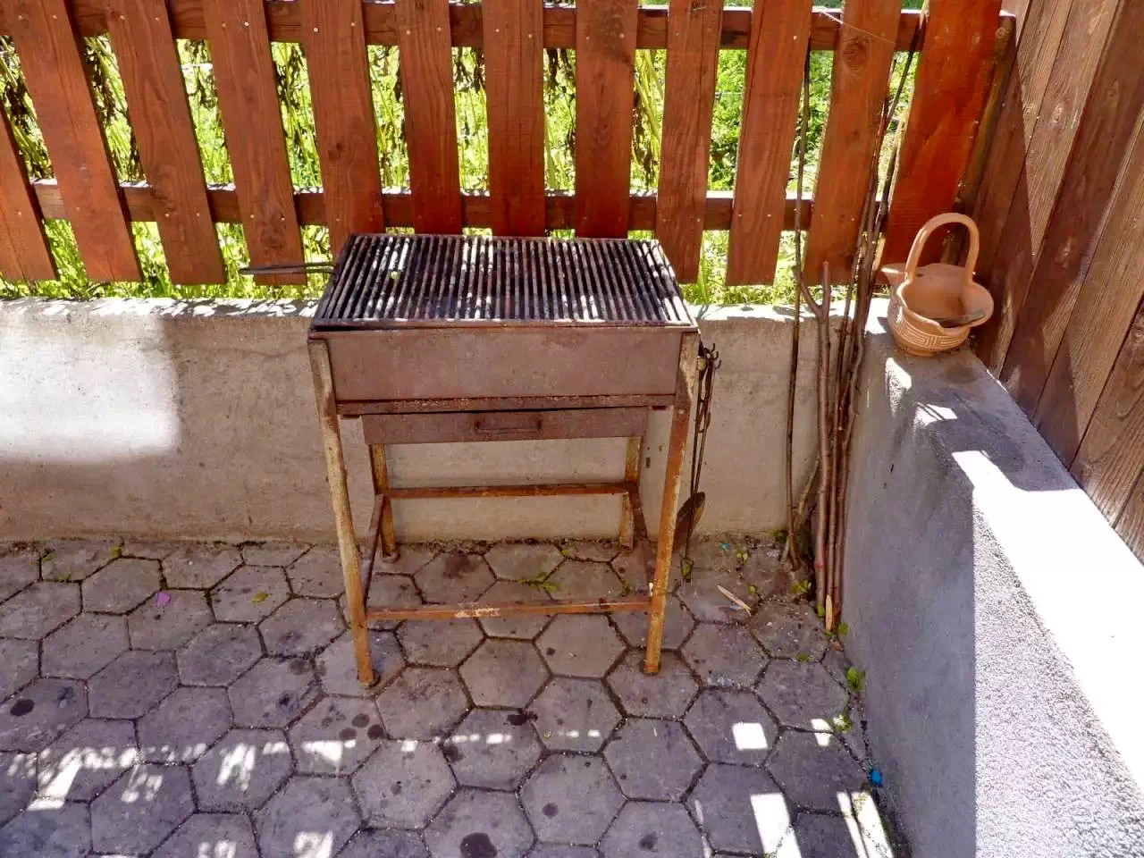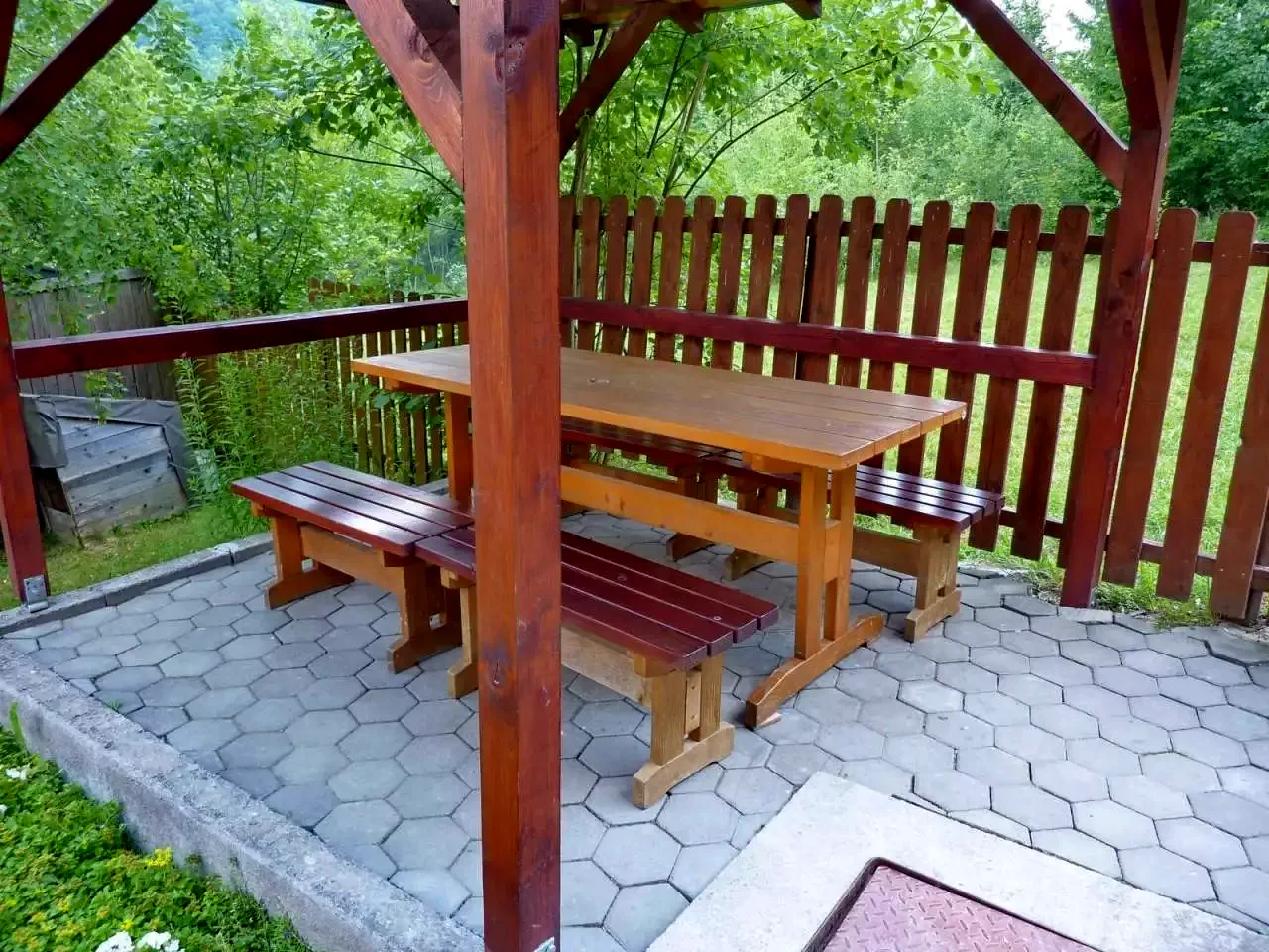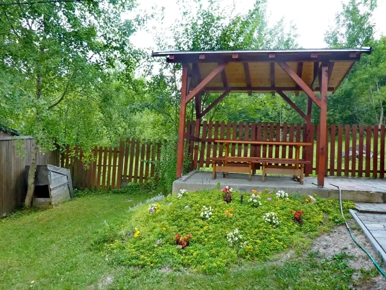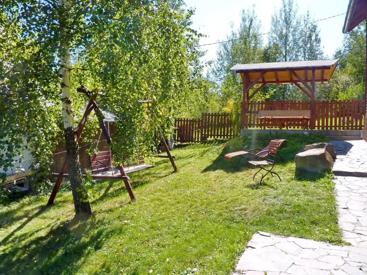 - Foișorul acoperit, cuptorul pentru grătar și ceaunul sunt perfecte pentru gătit în aer liber, iar șezlongurile și leagănul sunt ideale pentru relaxare.