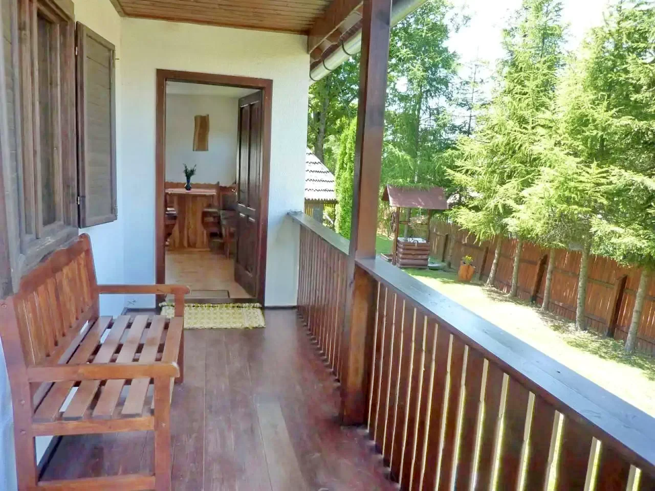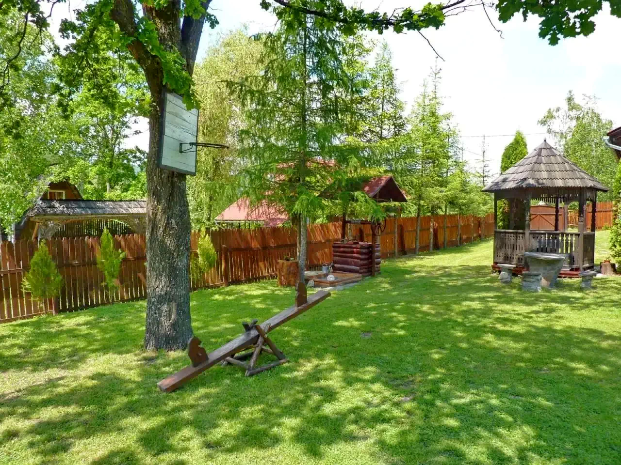 - În curtea cabanei, o filigorie acoperită, terasă, șezlonguri, leagăn, topogan, nisipar și coș de baschet asigură distracția, mai ales pentru familii cu copii.