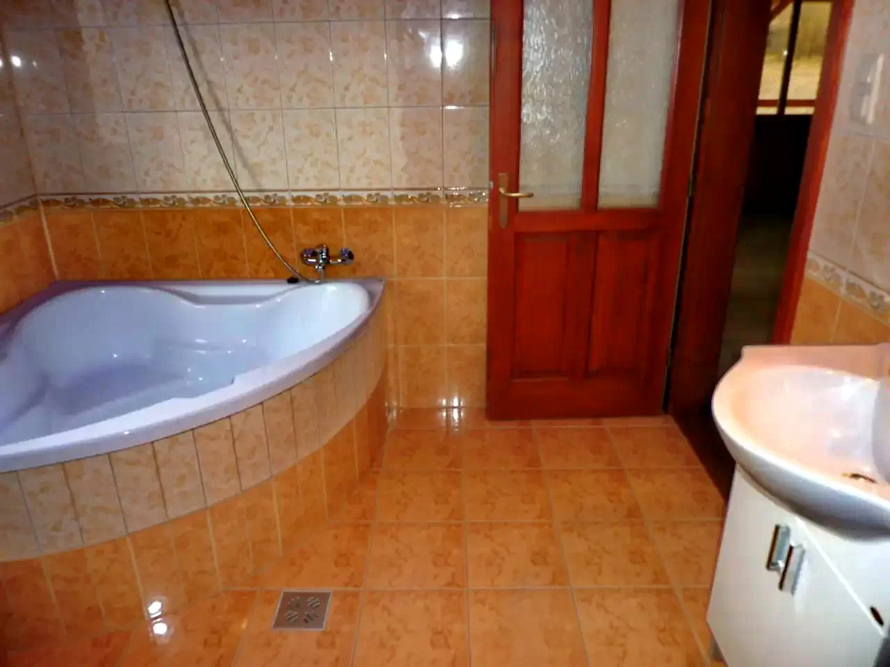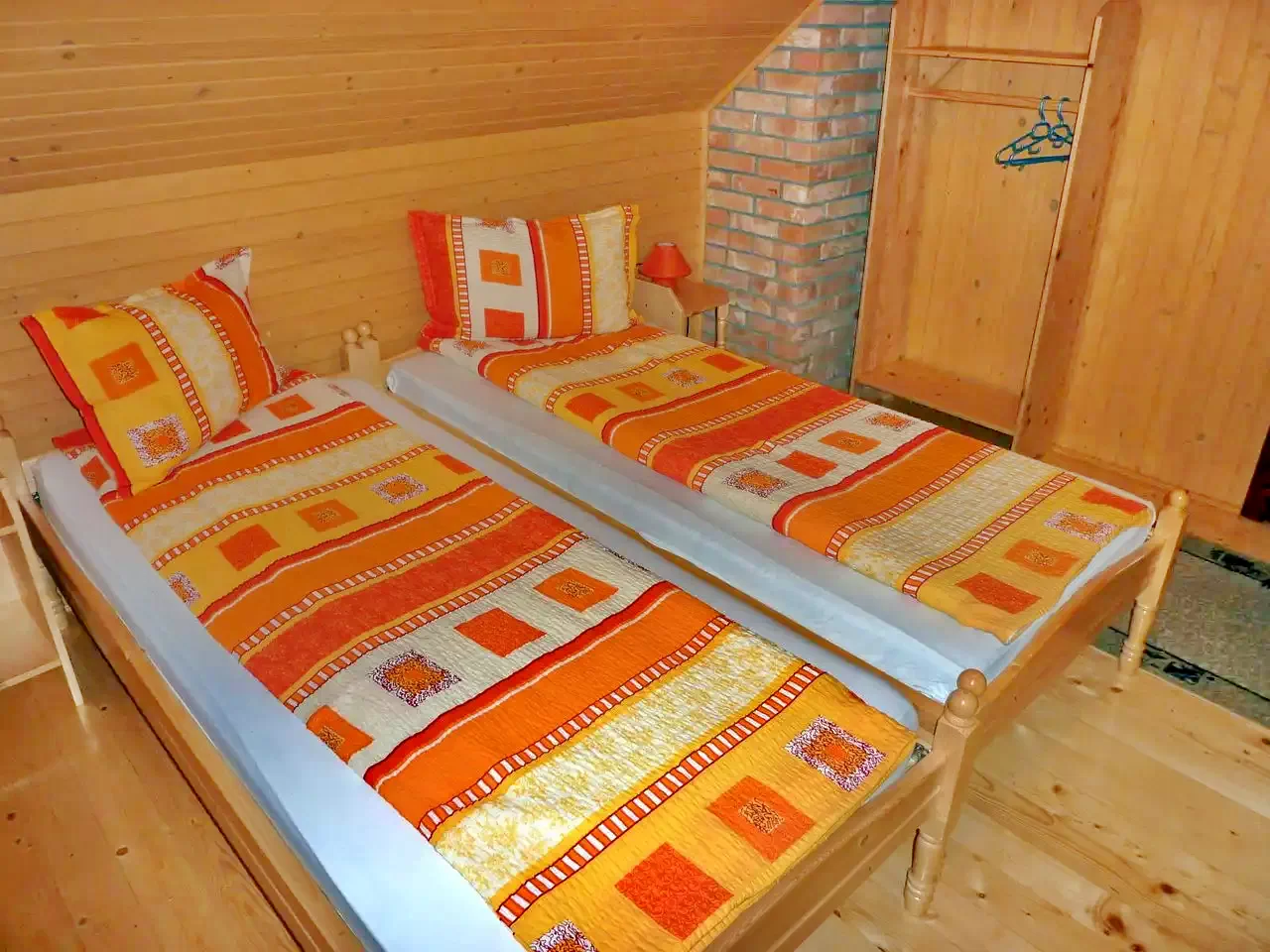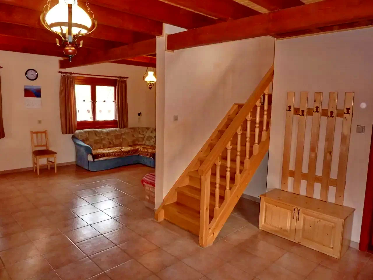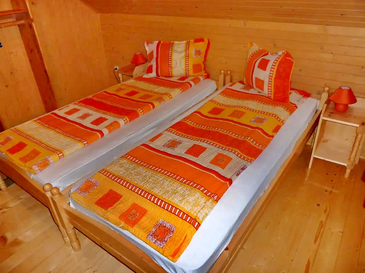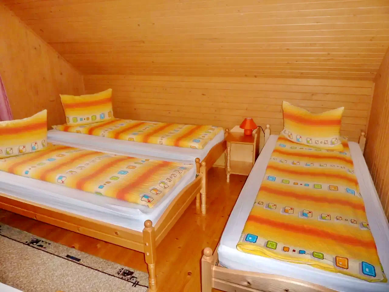 - La etaj sunt trei camere: două camere cu câte un pat dublu, a treia cameră cu un pat dublu și un pat single, plus o baie (cu duș, WC și chiuvetă).