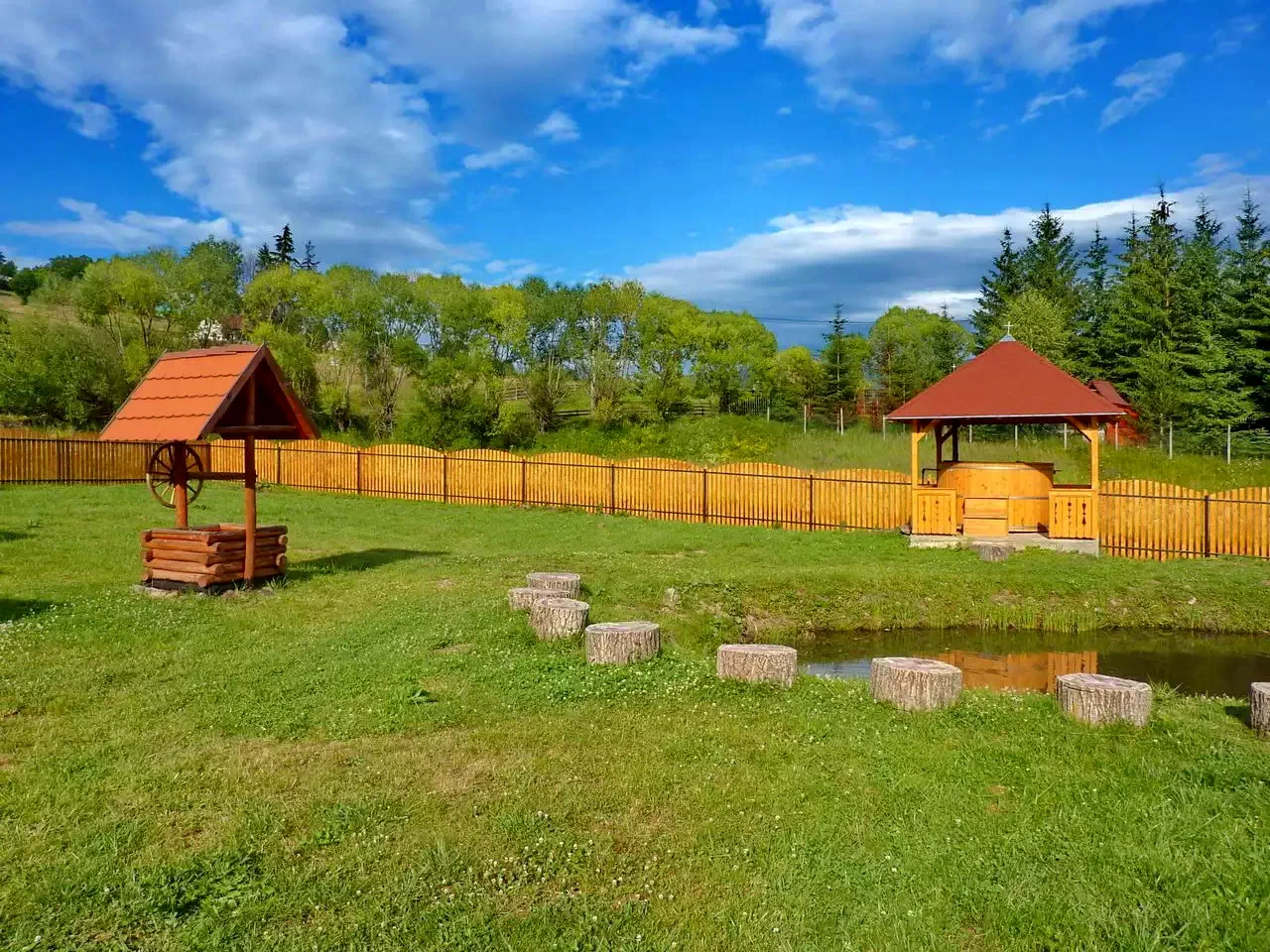 - Pentru gătit în aer liber, curtea de 2000 m² dispune de loc de foc, ceaun și disc, cu peisajul impresionant al Munților Harghita în fundal.