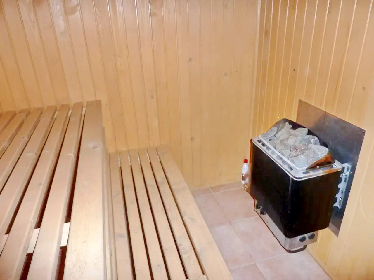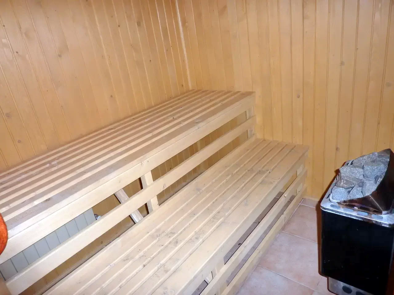 - La parter se află un living-sala de mese, o bucătărie modernă, o baie (cu cadă, WC și chiuvetă), o saună și o cameră cu un pat supraetajat (partea de jos pentru două persoane, partea de sus pentru una) și un pat single.