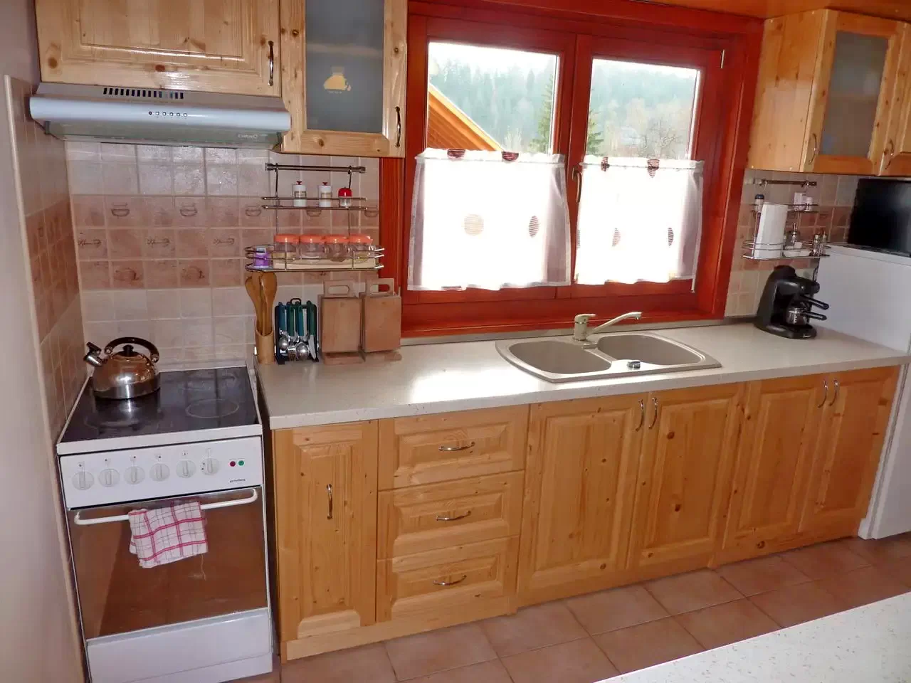 Bucătărie: Plită electrică, mașină de spălat vase, frigider.