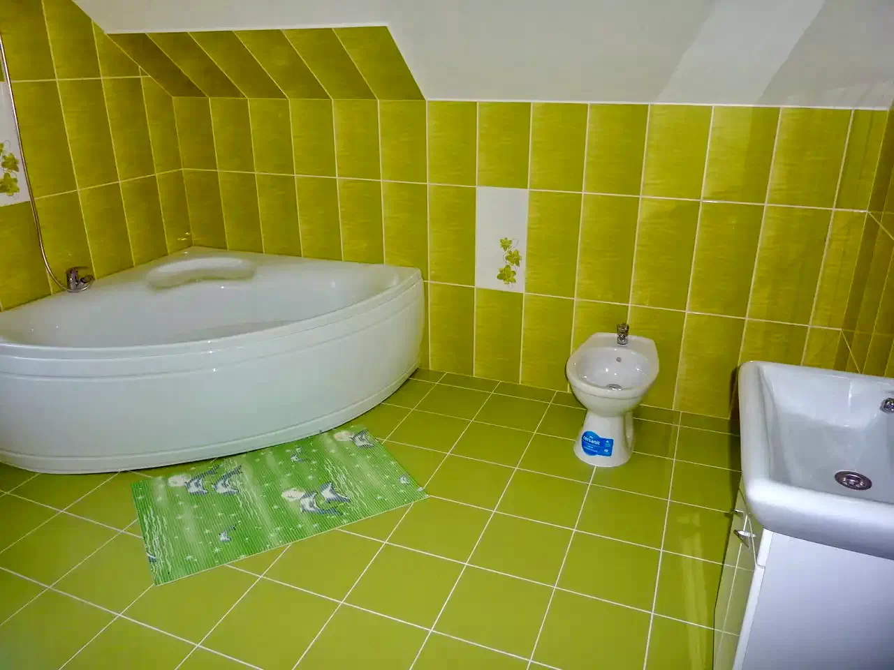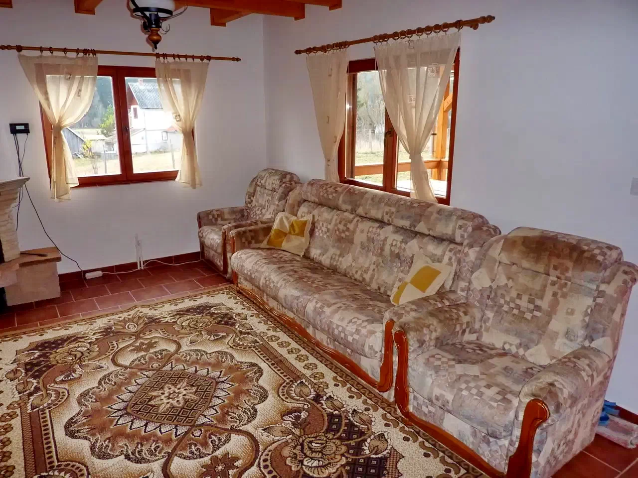- La parter se află un living-sala de mese, o bucătărie modernă, o baie (cu cadă și chiuvetă), o toaletă separată și o cameră cu trei paturi single.