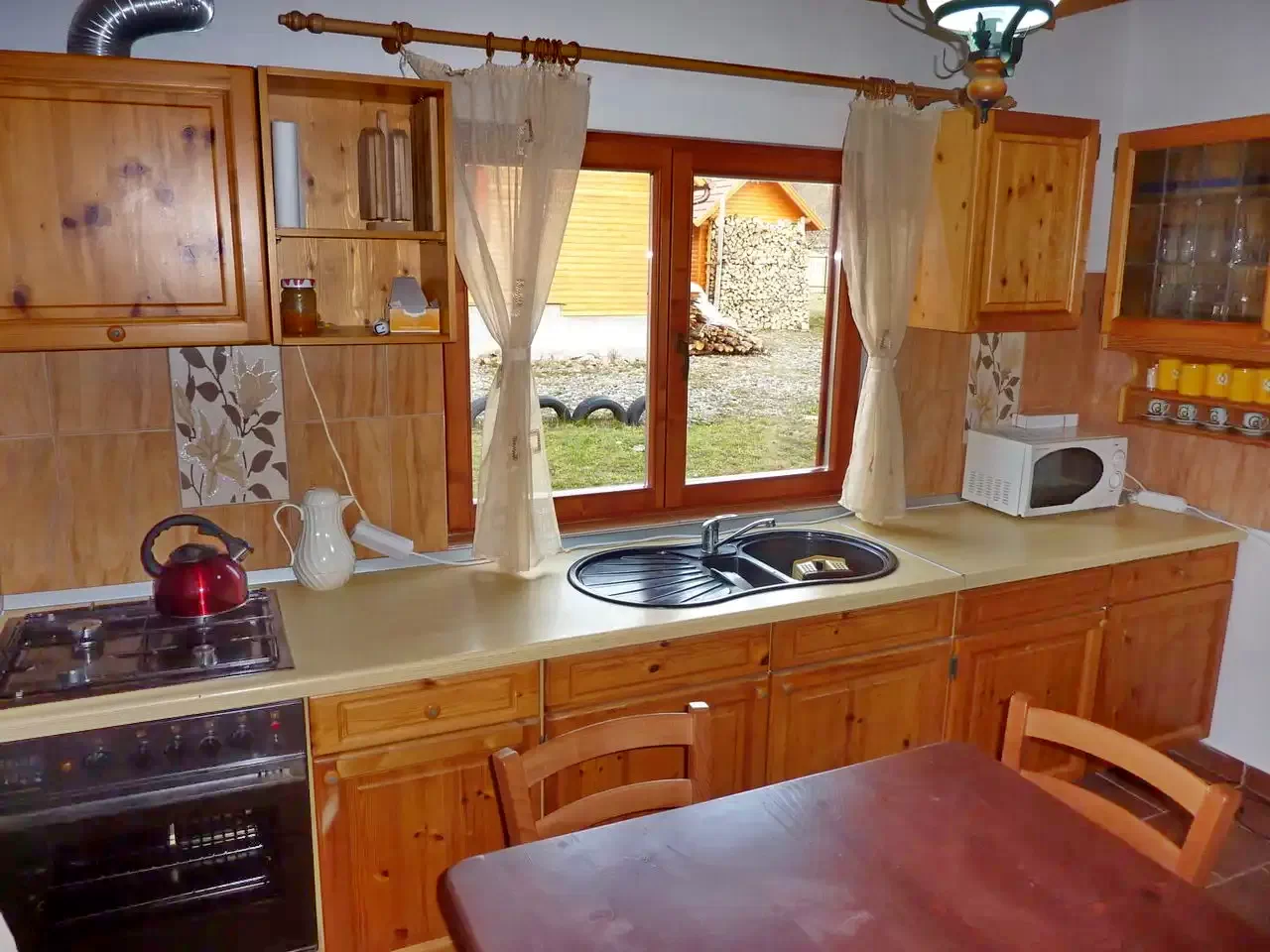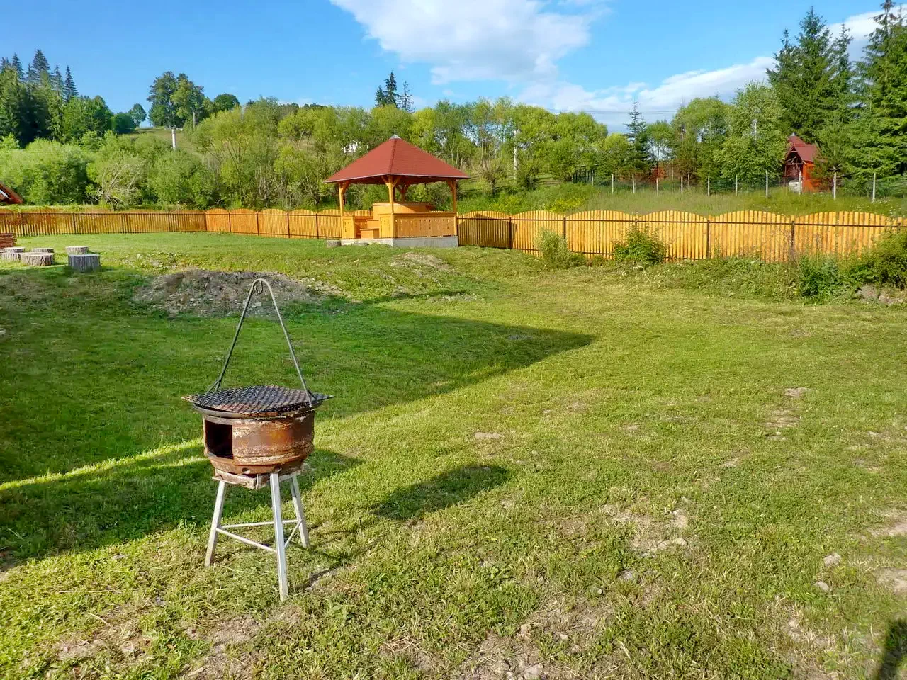 - Pentru gătit în aer liber, curtea de 2000 m² dispune de loc de foc, ceaun și disc, cu peisajul impresionant al Munților Harghita în fundal.