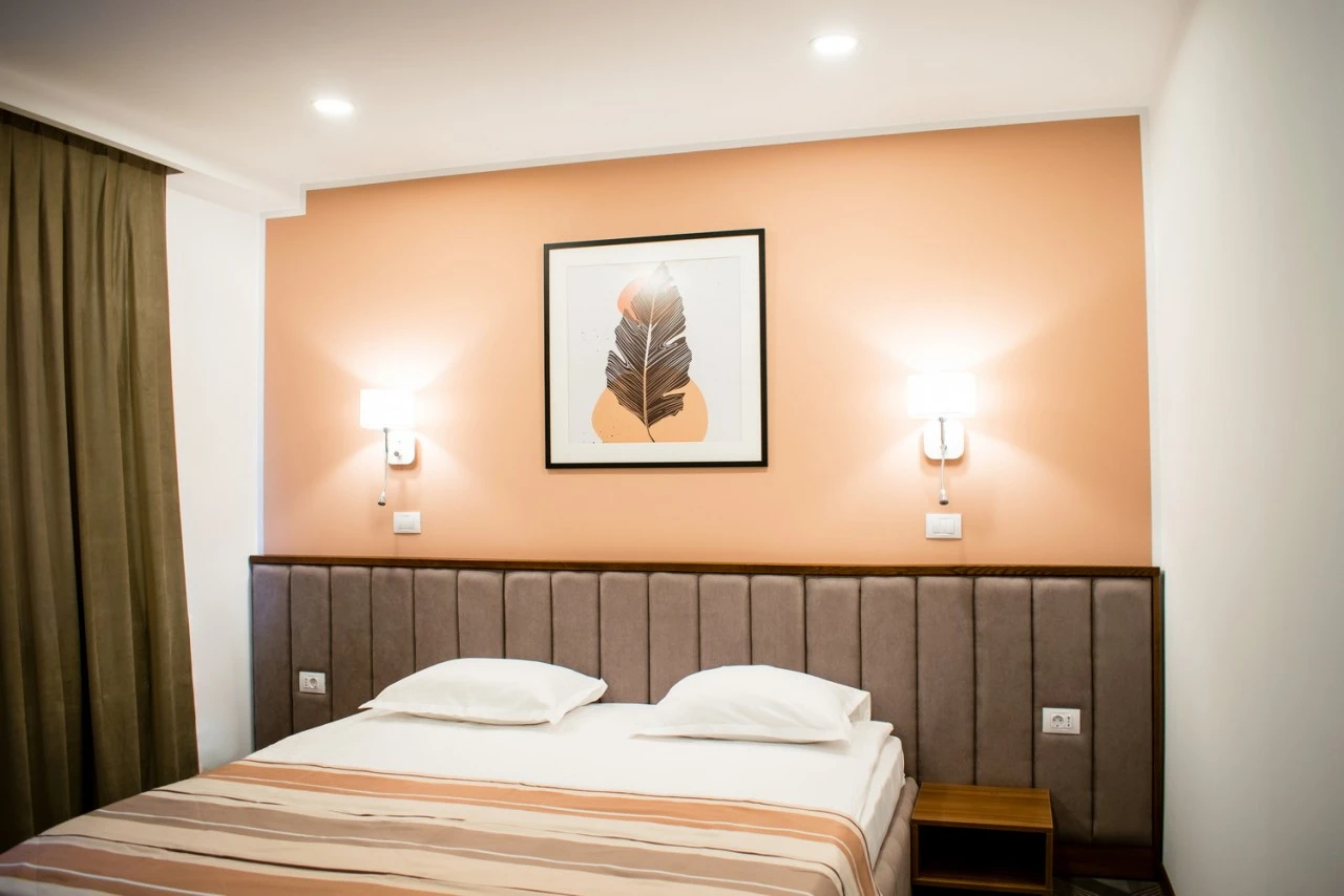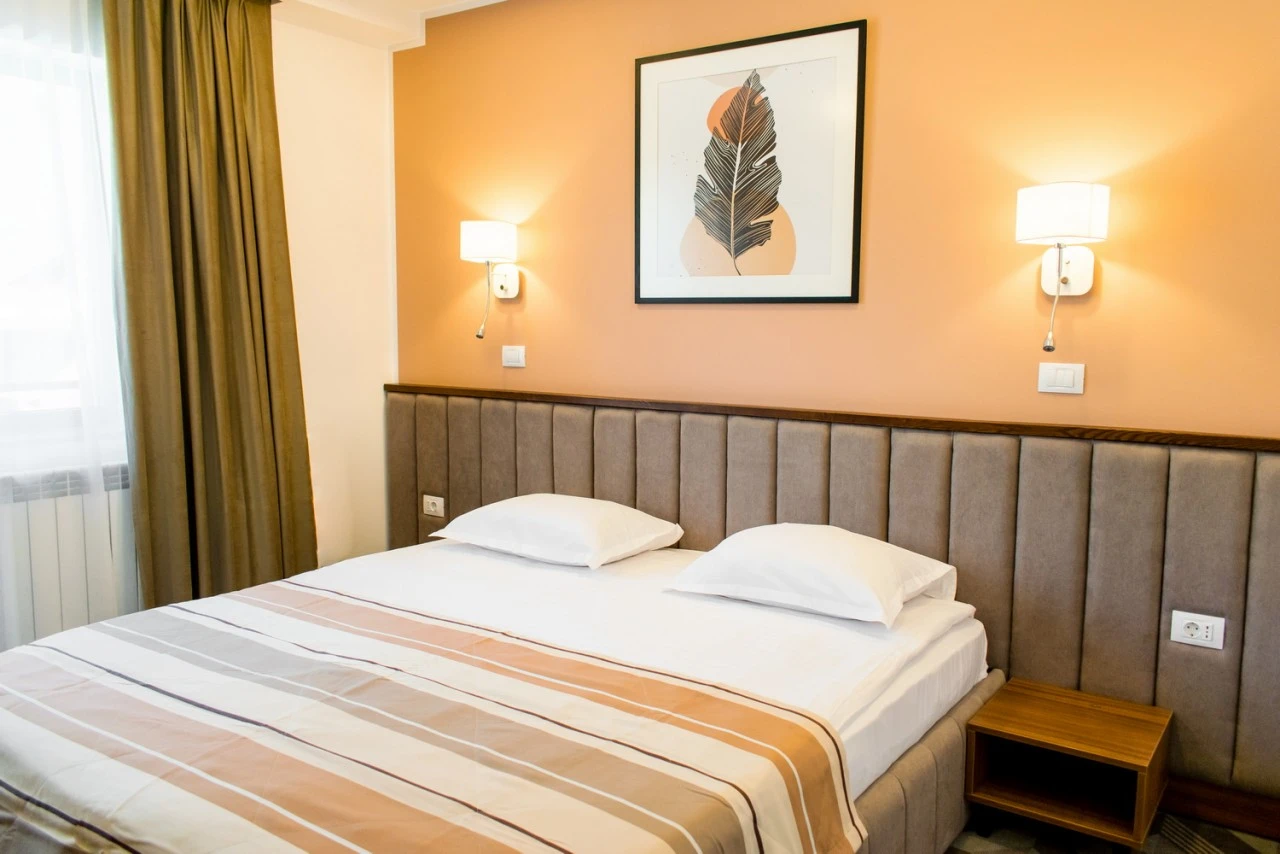 - Cameră dublă: dotată cu pat matrimonial, baie privată cu cabină de duș, TV+cablu, balcon, minibar și acces gratuit la internet WiFi.