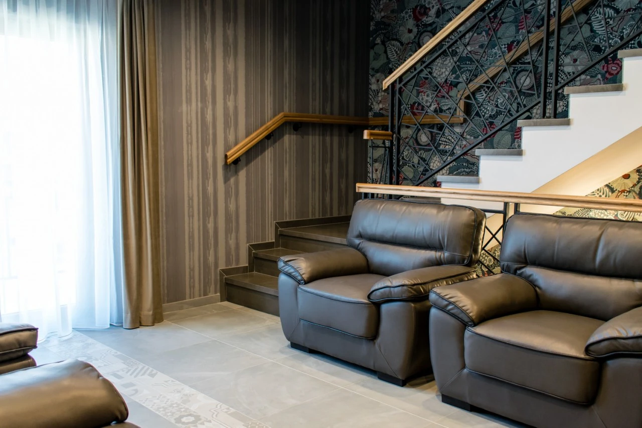 - O cameră mansardată cu canapea fixă (neextensibilă) și living spațios.