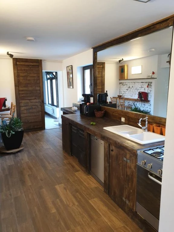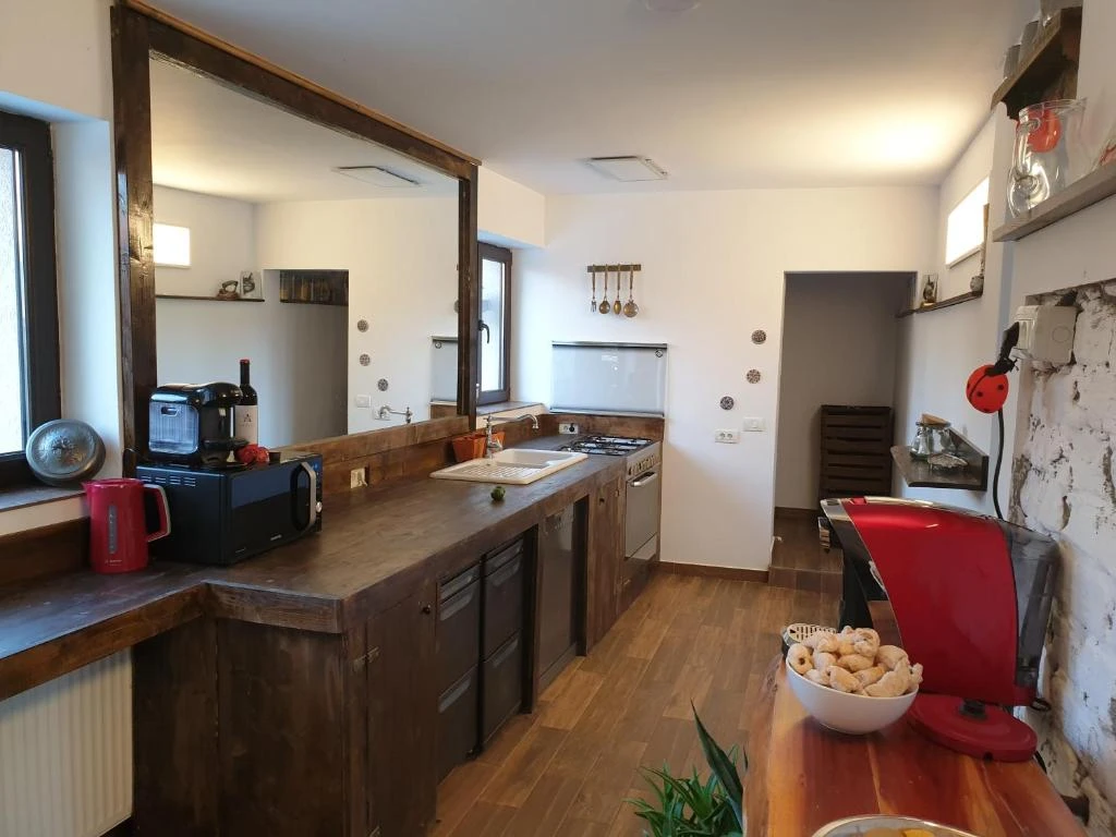 - La parter se află un living spațios și o bucătărie complet echipată, unde oaspeții își pot prepara mesele după preferințe.