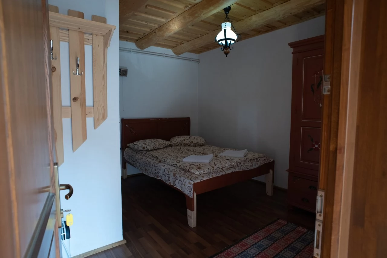 - 1 camera cu pat matrimonial (direct sub partea de turn) - cu baia comuna (aflata in zona Wellness al pensiunii).