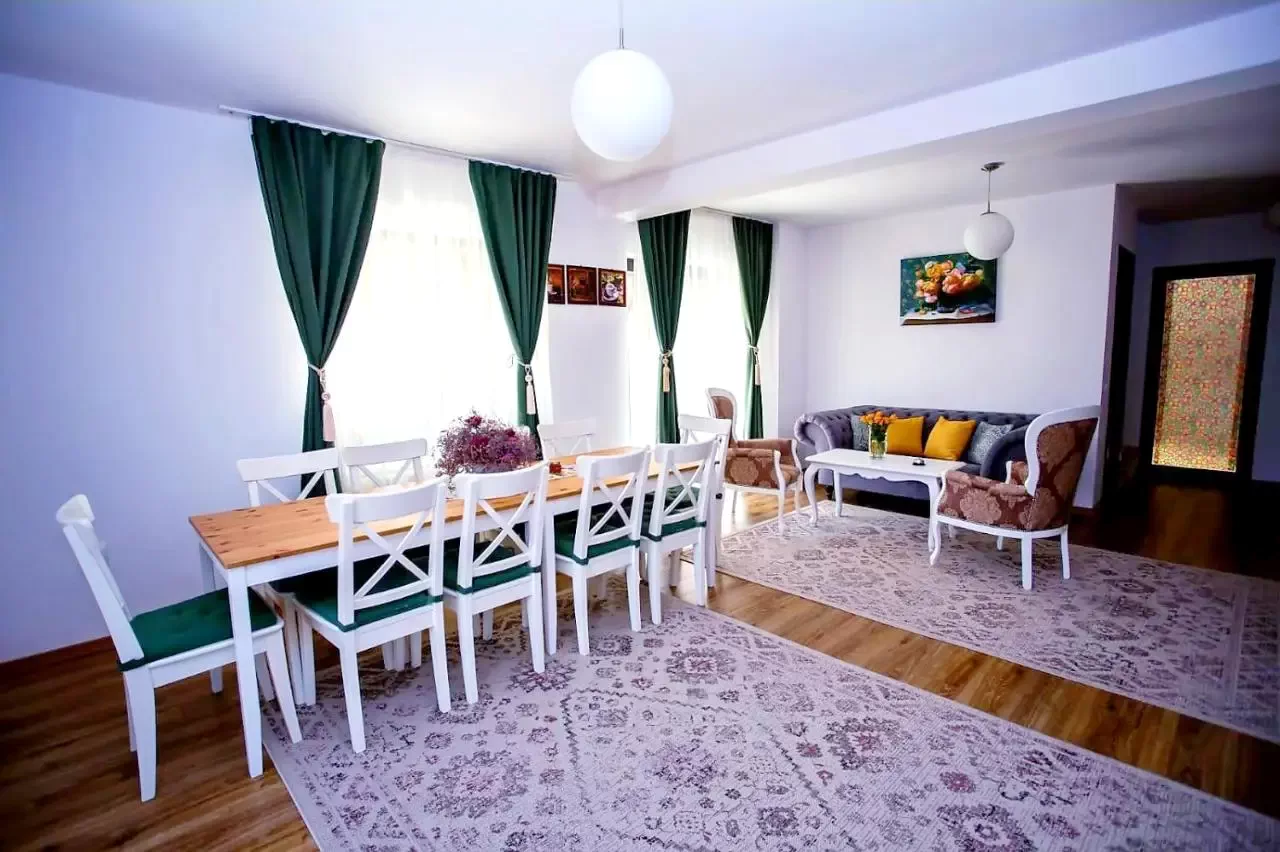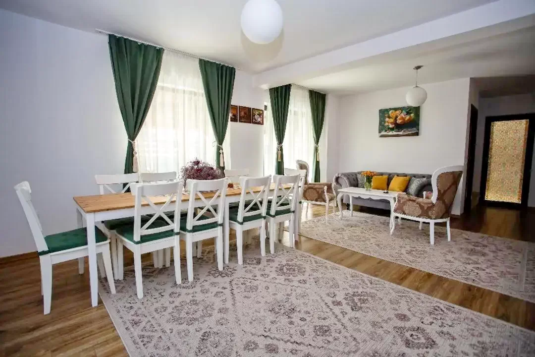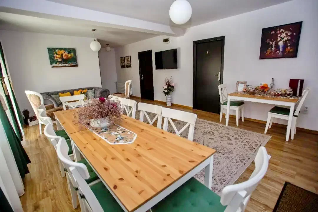 - Livingul este generos, prevăzut cu trei mese cu cate patru scaune fiecare, televizor, canapea si măsuța pentru cafea, cu ieșire pe terasa acoperita si in bucătărie.