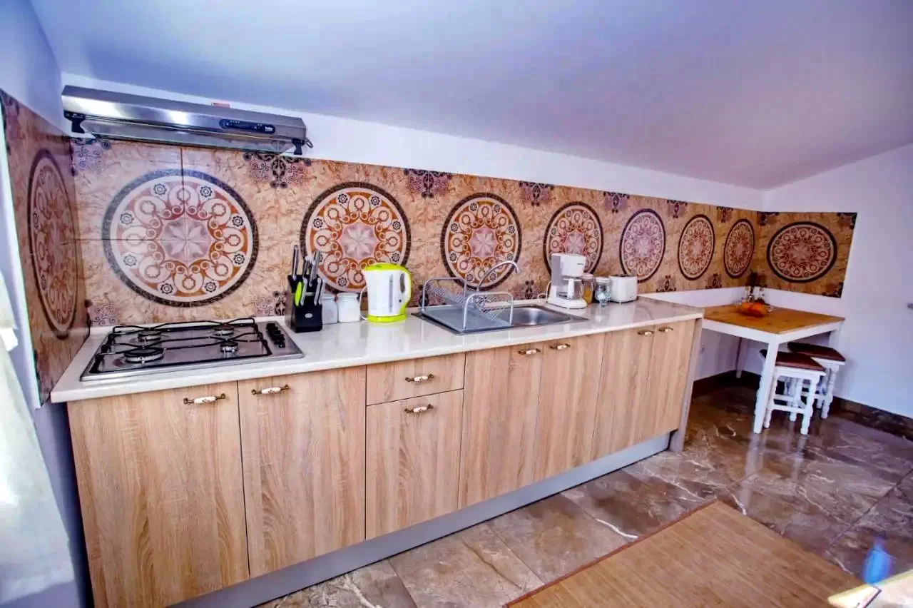 - Oferă bucătărie mobilata si utilata, cu plita-cu 4 zone de gătit, filtru de cafea, prăjitor de pâine, cuptor cu microunde, frigider, masa cu taburete, tacâmuri, vesela, mașina de spălat vase, si condimente.