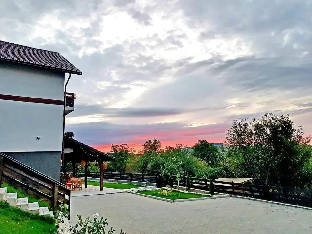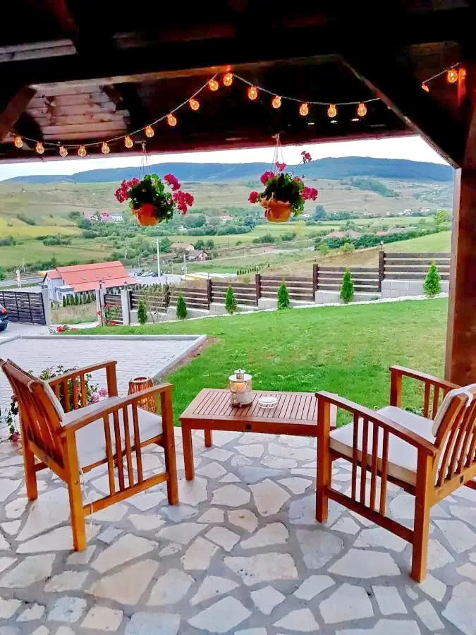 - Terasa exterioara acoperita destinata oaspeților, este echipata cu mobilier de exterior foarte comod si relaxant, fiind unită printr-o mică alee din dale, de locul unde se afla grătarul si ceaunul (si evident lemnele de care aveți nevoie).